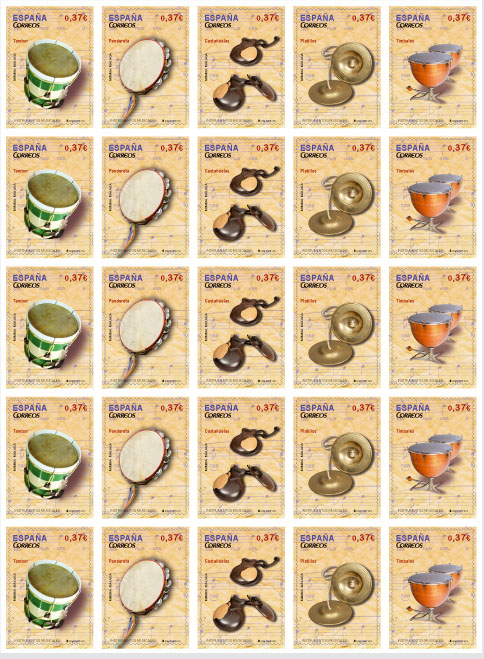 Según informa Correos, Dios mediante, el 22 de febrero se pondrá en circulación una serie de sellos de Correos autoadhesivos denominada Instrumentos Musicales 2013. La serie se compone de cinco sellos en los que se reproducen las siguientes piezas: Tambor, Pandereta, Castañuelas, Platillos y Timbales. Todas las piezas que se reproducen, salvo los Timbales, proceden del Museo Interactivo de la Música, de Málaga (MIMMA).