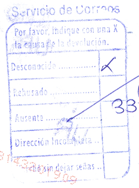 CAUSA DE SU DEVOLUCIÓN (color azul), con apartados para indicar la causa, (utilizada el 25/11/2012 en U.R.1 Talavera de la Reina, Toledo)
