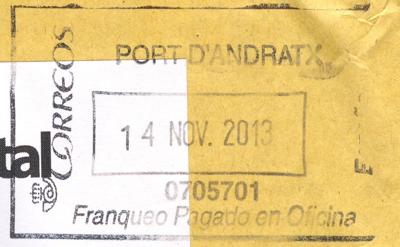 Por si acaso esta marca fuese distinta de la catalogada, ya que en el catálogo figura el nombre de la oficina en tres líneas y aquí aparece en dos líneas, la indico. Es la siguiente: