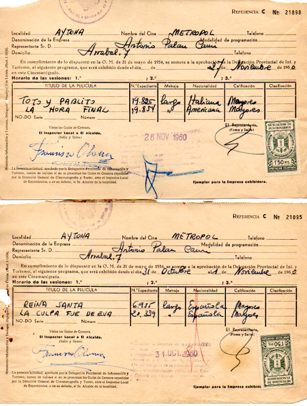 Tres solicitudes de aprobación de proyecciones cinematográficas para el cine Metropol de Aytona, año 60, con timbres de aportación voluntaria (!) a la Mutualodad de Funcionarios del Ministerio de Información y Turismo