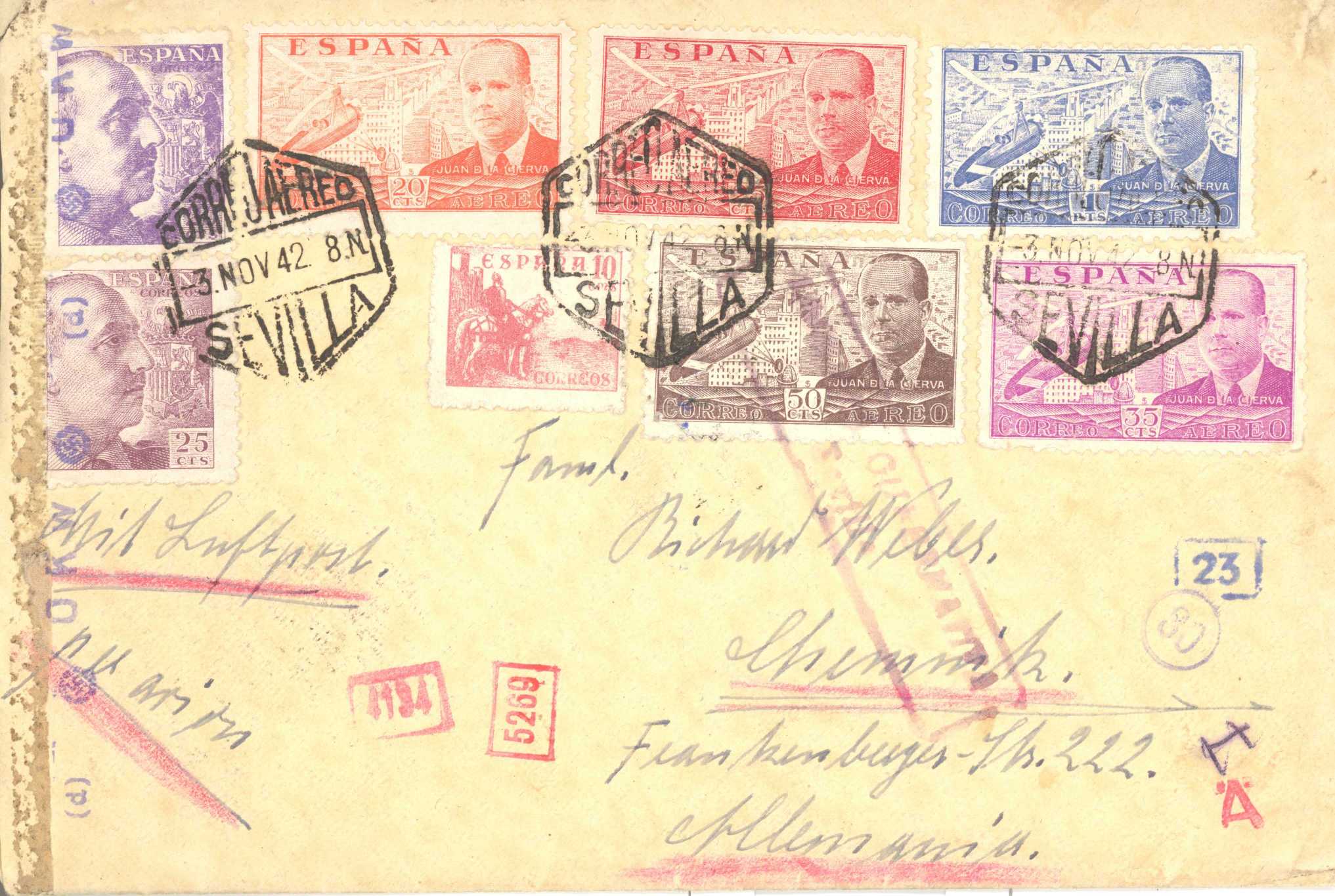 Lleva a la izda una bonita censura alemana de impresión mecánica con leyenda OKW (correspondientes a Oberkommando der Wehrmacht, o Estado Mayor del Ejército) de la estación de Múnich (con letra D entre paréntesis como código de identificación).