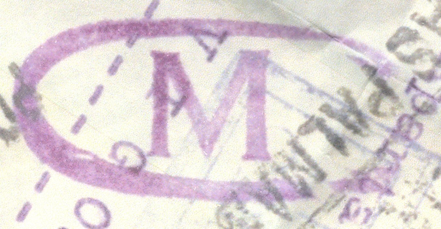 Por aquello de utilizar un hilo ya abierto y dado que la carta circula por correo aéreo entre Las Palmas de Gran Canaria y Vigo, reproduzco un frontal de una carta donde se puede observar la existencia de una marca o tampón que lleva una M (eme) dentro de un óvalo en color violeta, sin cerrar por la parte derecha.