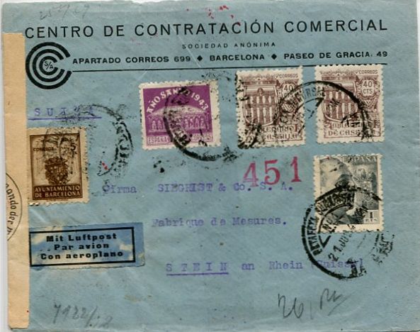 Salvo error por mi parte (error más que probable), las opciones para el correo aéreo pasaban por Roma o Marsella (Ala Littoria o Lufthansa) pero:JOSEAN escribió:Buenas, a ver si alguien me puede dar más datos de esta marca, que aparece en una carta certificada a Suiza, ¿porque no había servicio aéreo?