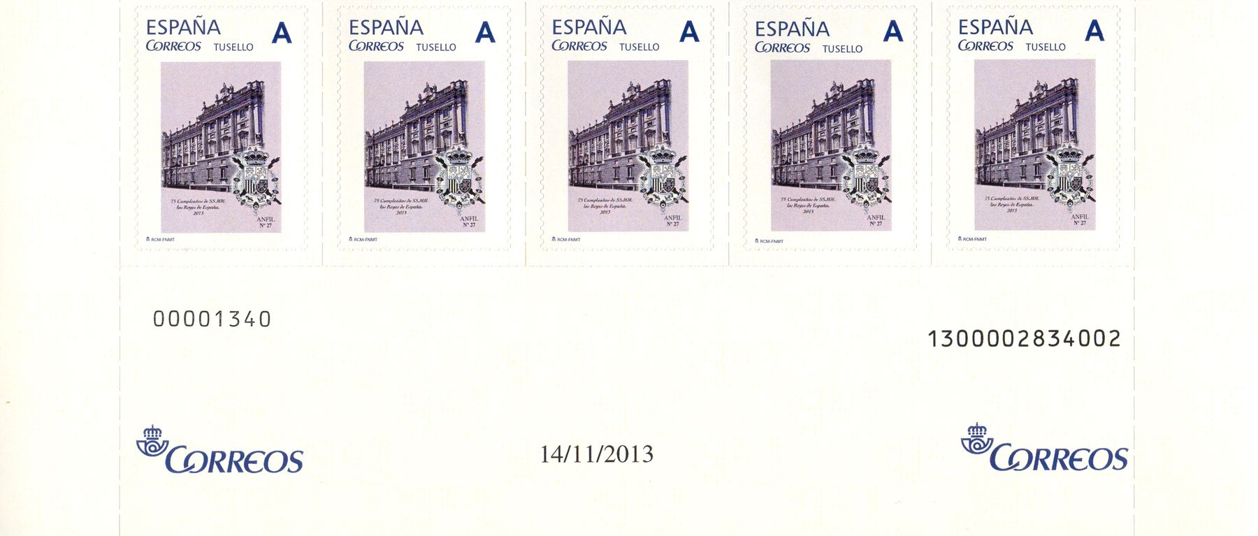 El segundo de ellos hace el número 27 de su colección y se titula: "75 Cumpleaños de SS. MM. los Reyes de España 2013". Por un despiste de Correos, se puede observar que en la cabecera del mismo figura la expresión "75 Aniversario S.S.M.M.".
