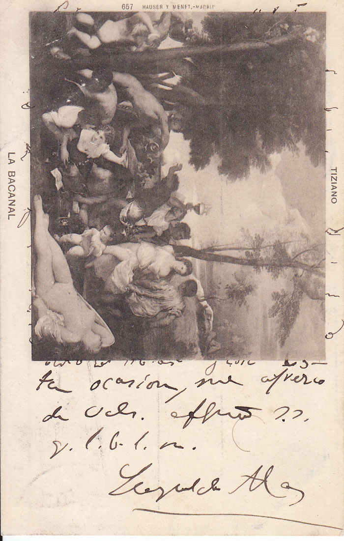 Interesantísima esta postal con la firma de Clarín, uno de los grandes del XIX en mi opinión. Debió ser de las últimas cosas que hizo en este mundo, ya que falleció en junio de 1901, y los últimos meses de vida fueron muy penosos debido a su enfermedad.