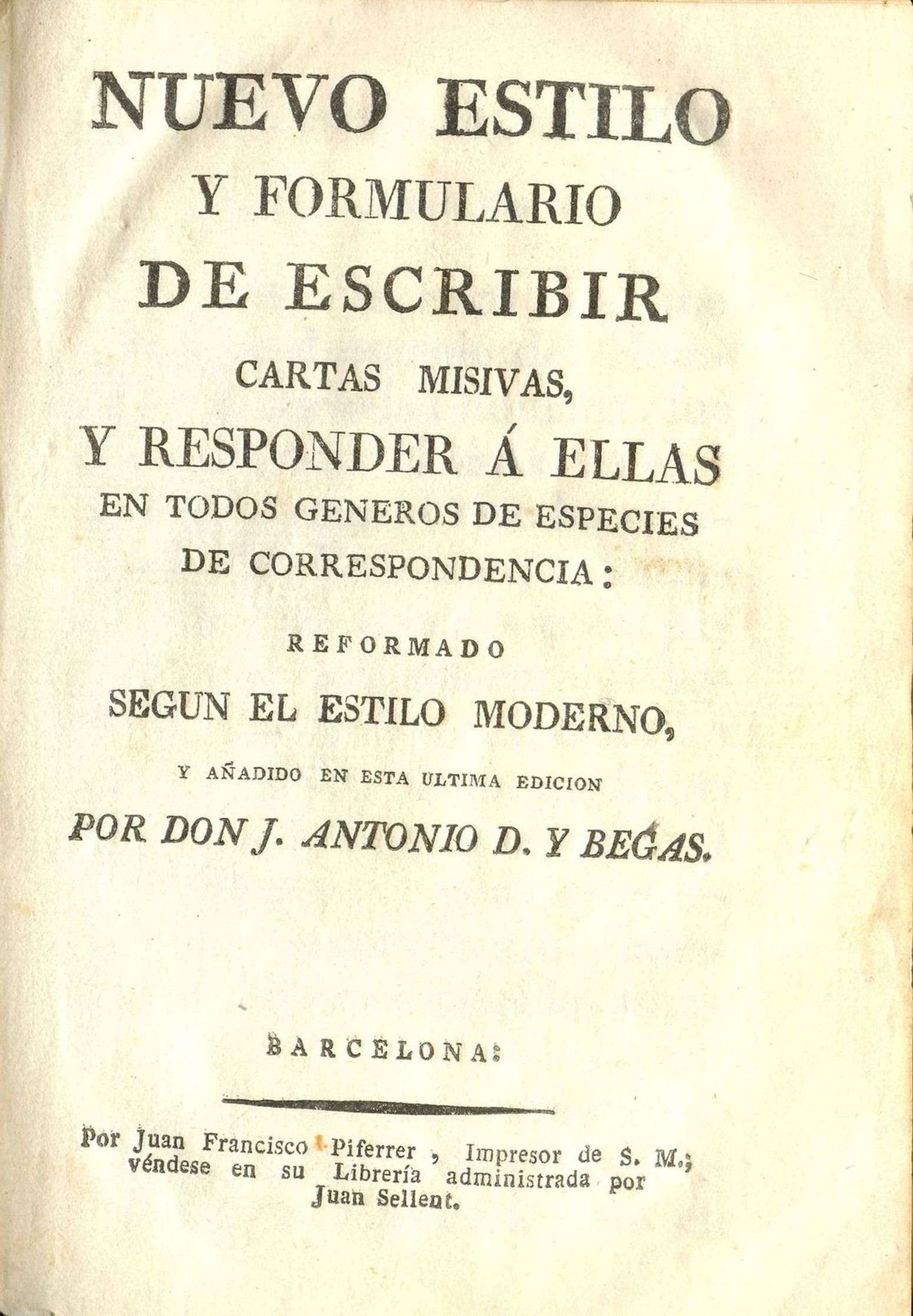 NUEVO ESTILO Y FORMULARIO DE ESCRIBIR CARTAS MISIVAS, Y RESPONDER A ELLAS, EN TODOS GÉNEROS DE ESPECIES DE CORRESPONDENCIA: REFORMADO SEGÚN EL ESTILO MODERNO, Y AÑADIDO EN ESTA ÚLTIMA EDICIÓN, J. Antonio D. y Begas, No consta fecha.