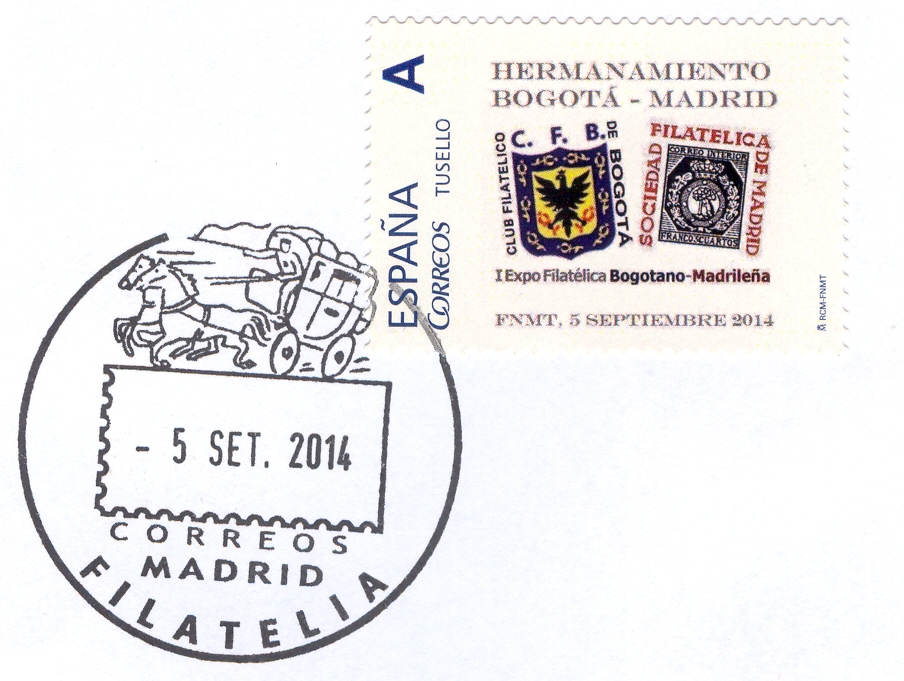 Con motivo de la celebración de la "I Expo Filatélica Bogotano-Madrileña", que está teniendo lugar en Madrid del 4 al 7 de septiembre actual, y del "Hermanamiento Club FFilatélico de Bogotá con Sociedad Filatélica de Madrid", la Sociedad Filatélica de Madrid (SOFIMA) ha editado un sello personalizado que hace referencia a estas manifestaciones y reproduce el escudo de ambas instituciones.