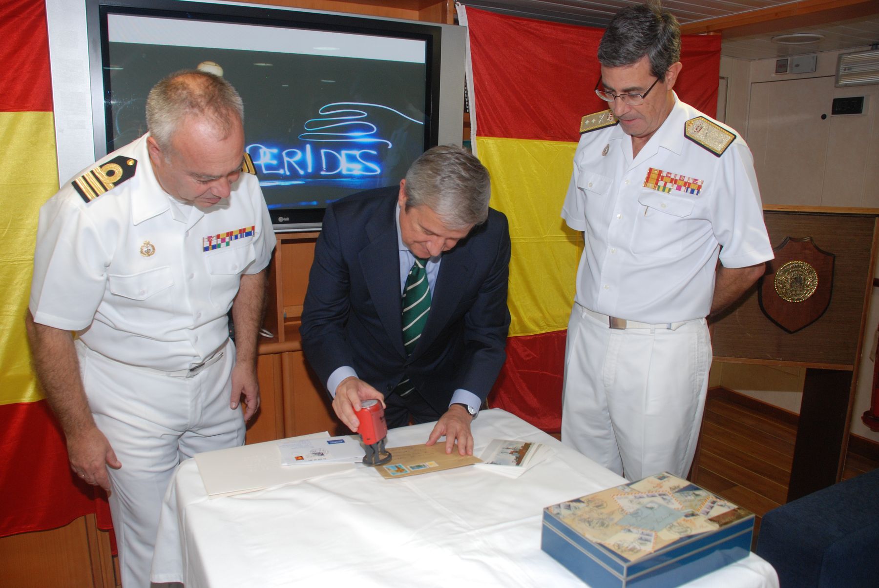 Reproduzco una fotografía donde aparecen, de izquierda a derecha, el Presidente de Correos, el Subsecretario de Fomento, y el Presidente de la Fábrica Nacional de Moneda y Timbre-Real Casa de la Moneda (FNMT-RCM), sosteniendo cada uno el sobre con los sellos, una vez estampado, por ellos mismos, el matasellos de presentación.