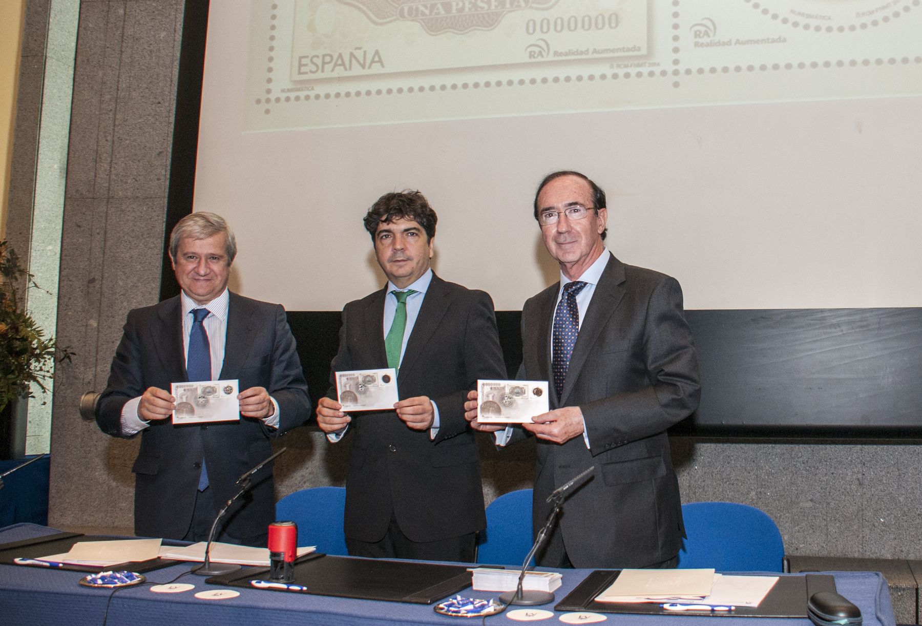 [hr]Madrid, 4 de noviembre de 2014.- El Subsecretario de Fomento, Mario Garcés Sanagustín, el presidente de la Fábrica Nacional de Moneda y Timbre (FNMT), Jaime Sánchez Revenga, y el Presidente de CORREOS, Javier Cuesta Nuin, han presentado hoy en la sede de la FNMT, dos sellos que homenajean a la peseta, moneda en uso desde 1868 hasta 2002 -fecha en que se puso en circulación el euro-, y por ende a la Numismática.