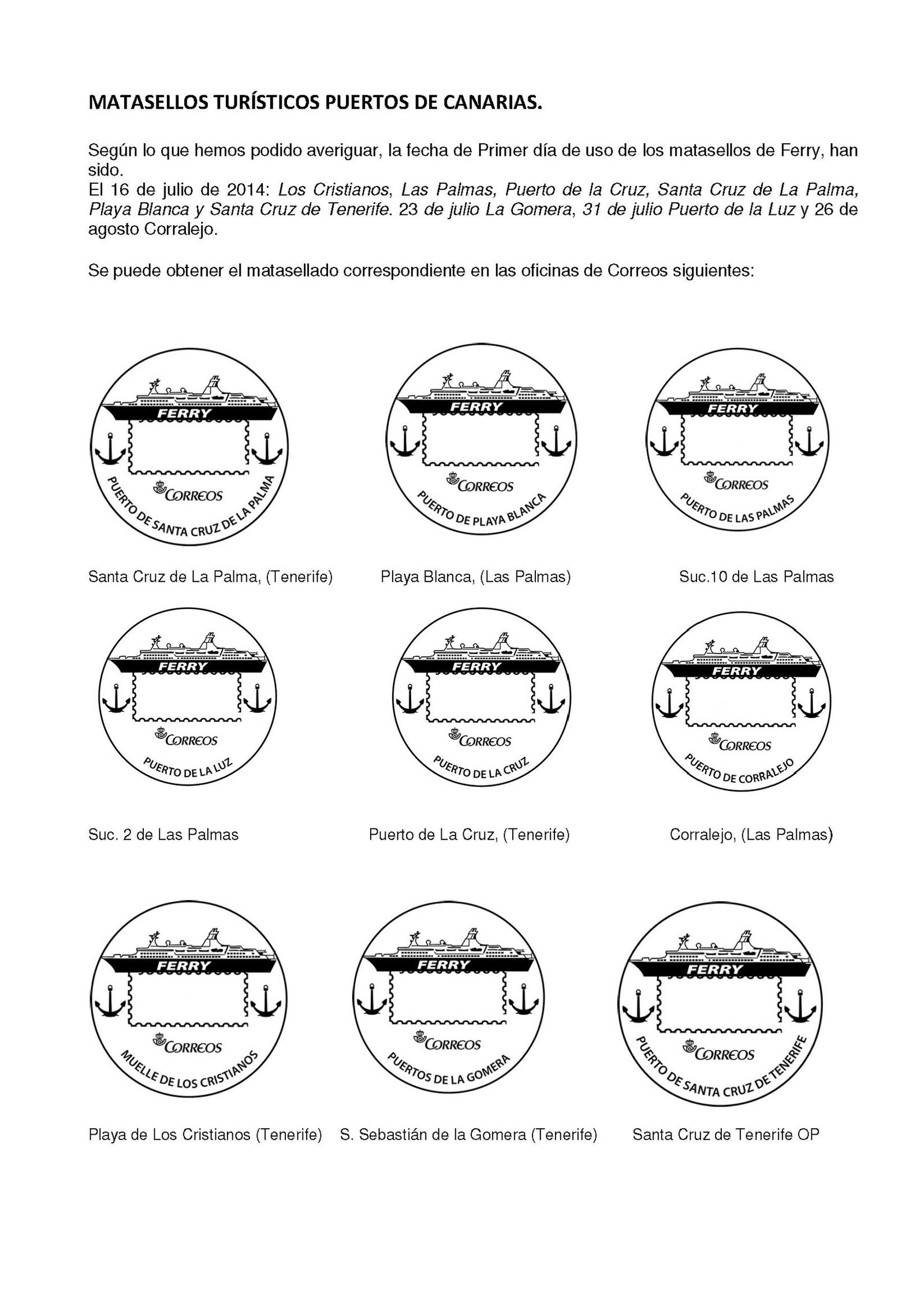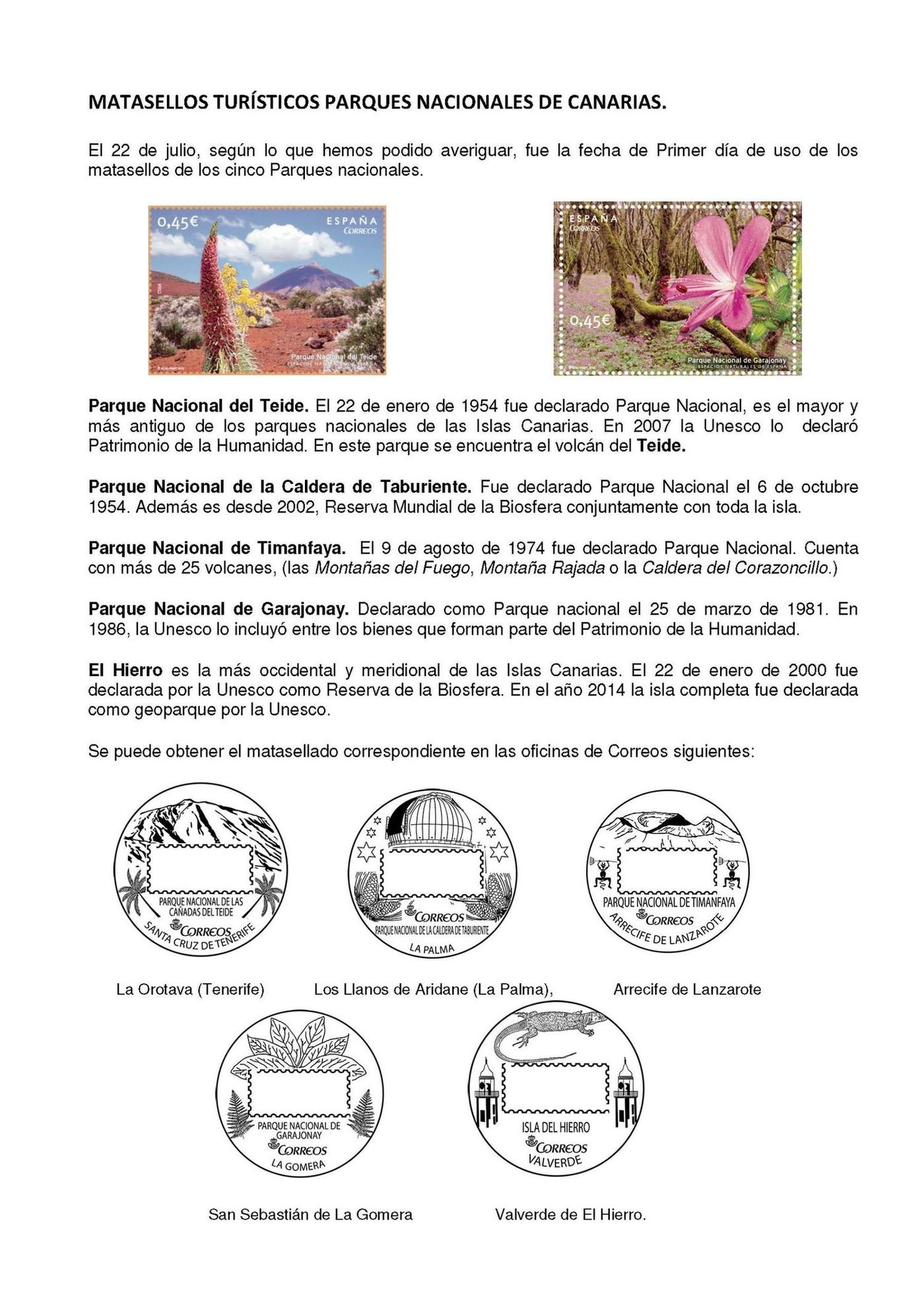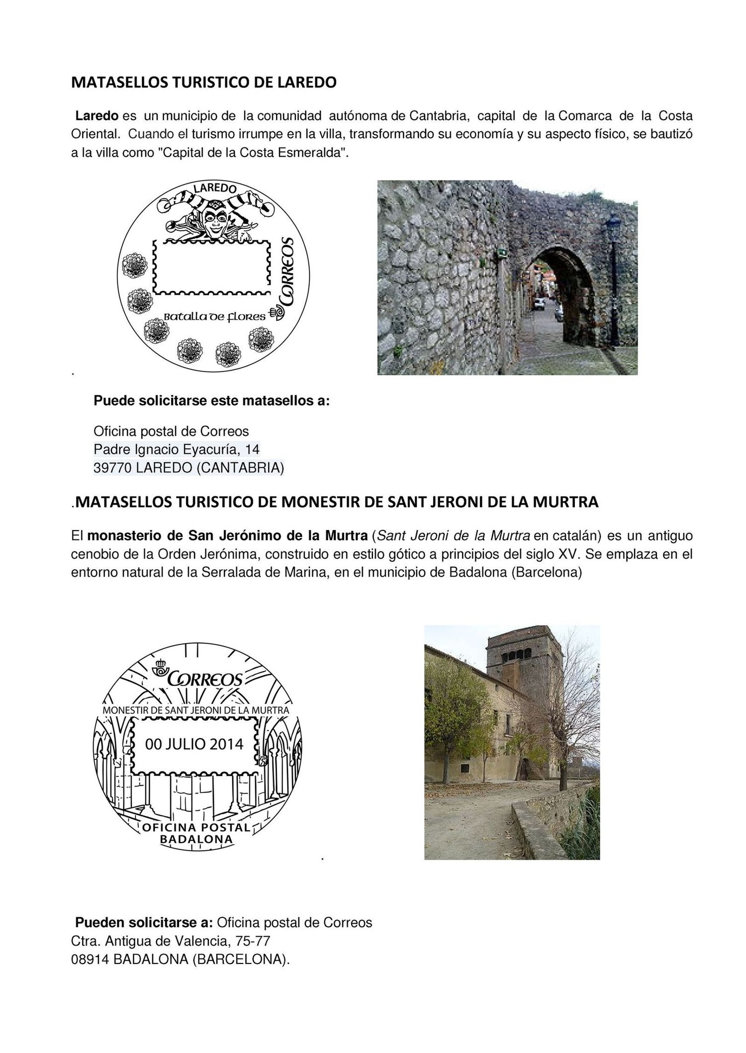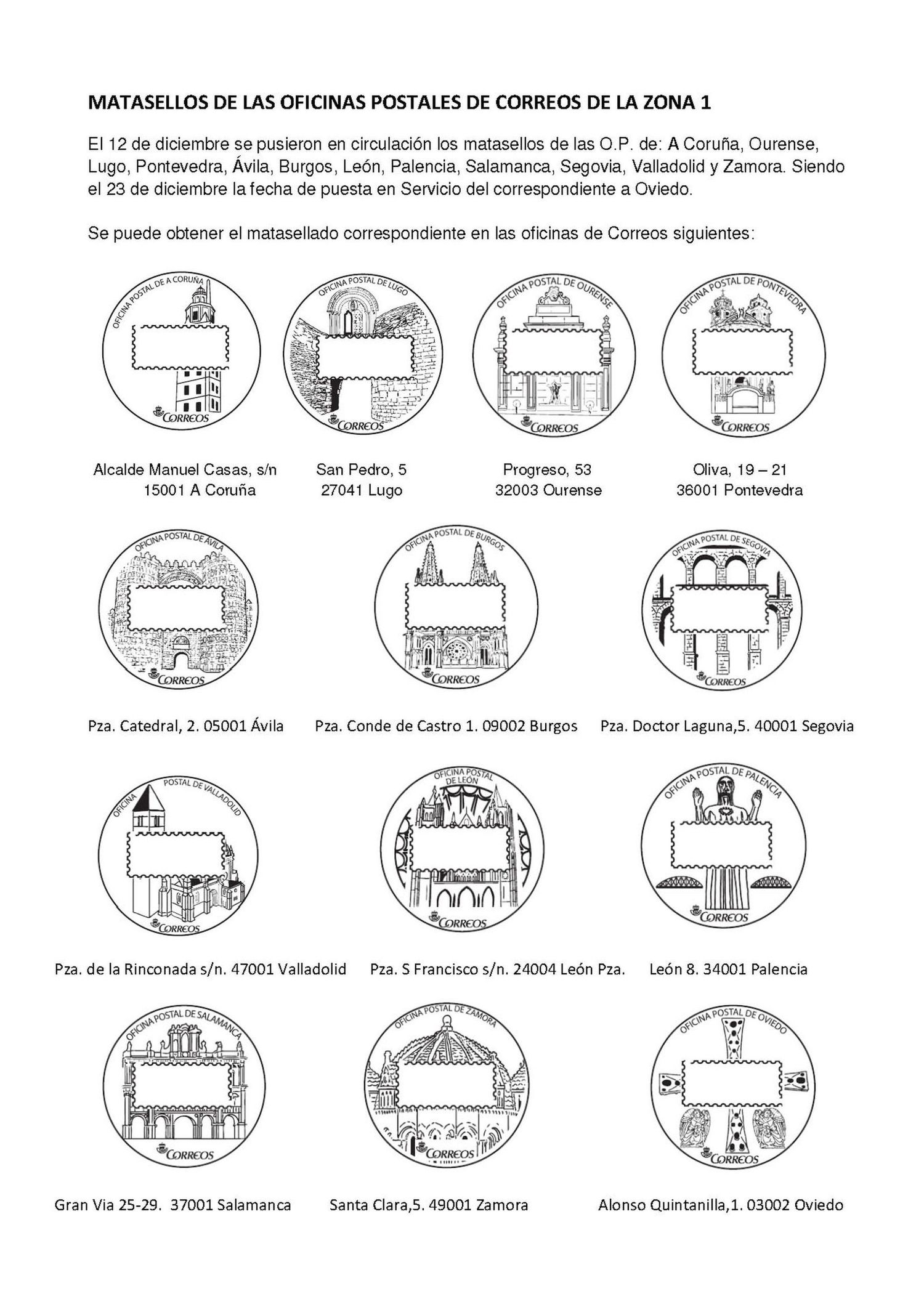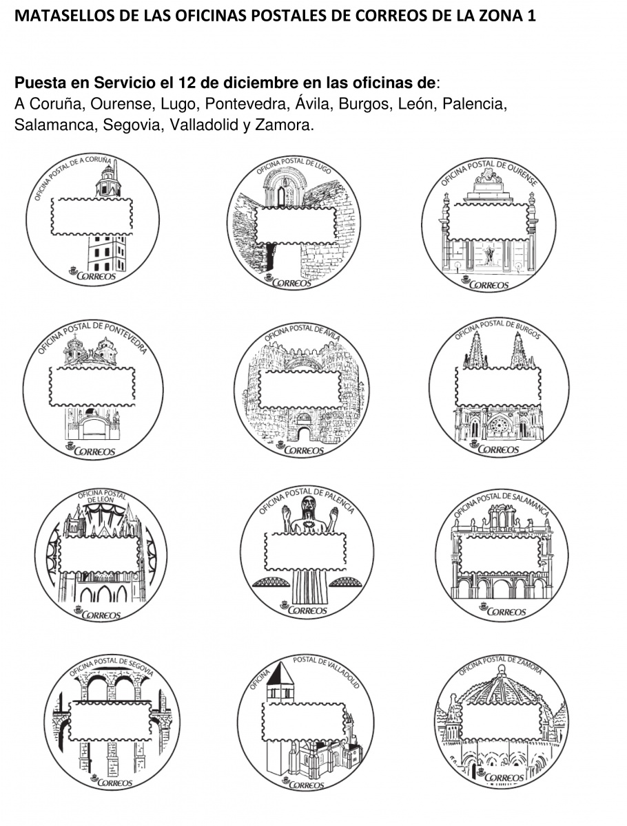 Así como otros 44 matasellos turísticos, para colaborar en la difusión de lugares y monumentos emblemáticos a través de los envíos postales, en Burgos, Carrión de Los Condes (Palencia), Astorga (León), Sarria (Lugo) y Santiago de Compostela (A Coruña) todos para el Camino de Santiago con la concha de peregrino como eje principal, Laredo (Cantabria) y Monestir de Sant Jeroni de la Murtra (Badalona), 14 en Canarias, de los que 5 están dedicados a los parques nacionales y los otros 9 a Puertos Canarios, 13 para las oficinas principales de la Zona 1, A Coruña, Lugo, Ourense, Pontevedra, Ávila, Burgos, León, Palencia, Salamanca, Segovia, Valladolid, Zamora y Oviedo y por ultimo 10 para las O.P. de la Zona 2, Bilbao, San Sebastián, Vitoria, Pamplona, Santander, Logroño, Soria, Huesca, Teruel y Zaragoza.
