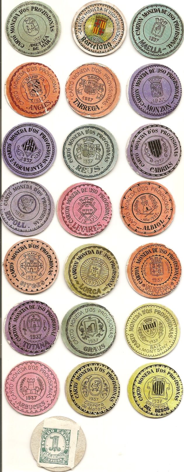 En ellas va escrito CARTO MONEDA D'OS PROVISIONAS, cuando deberia ser CARTRO MONEDA D'US PROVISIONAL, en caso de que fuesen algo legitimos, es curioso que lugares tan distantes usaran el mismo tipo de diseño, detras llevan un sello de la republica, la mayoria cifras, algun personaje, incluso usado y por colmo si os fijais en el de abajo lleva uno del estado español, siendo de 1937 de Valls (Tarragona).