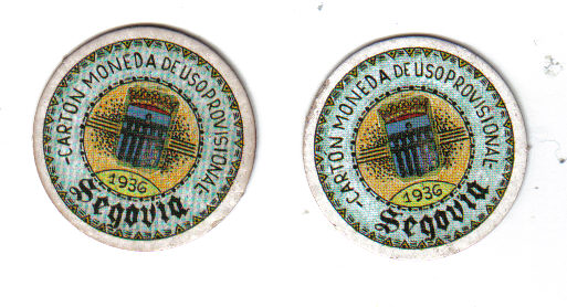 Por esa razón, cual sería mi sorpresa al mostrarme hace unos meses un amigo un puñado de cartones-moneda -así figura escrito en ellos- que había comprado poco antes en una de sus visitas al Rastro madrileño. Para empezar no se trataba de billetes sino de “monedas”, entendiendo como tales a unos discos de cartón del tamaño de una moneda -unos tres centímetros y medio de diámetro- e impresos por una sola cara, pero con la misma misión de funcionar como “dinero” provisional de uso local, principalmente para suplir la falta de calderilla debido a la escasez de metales provocada por la guerra.