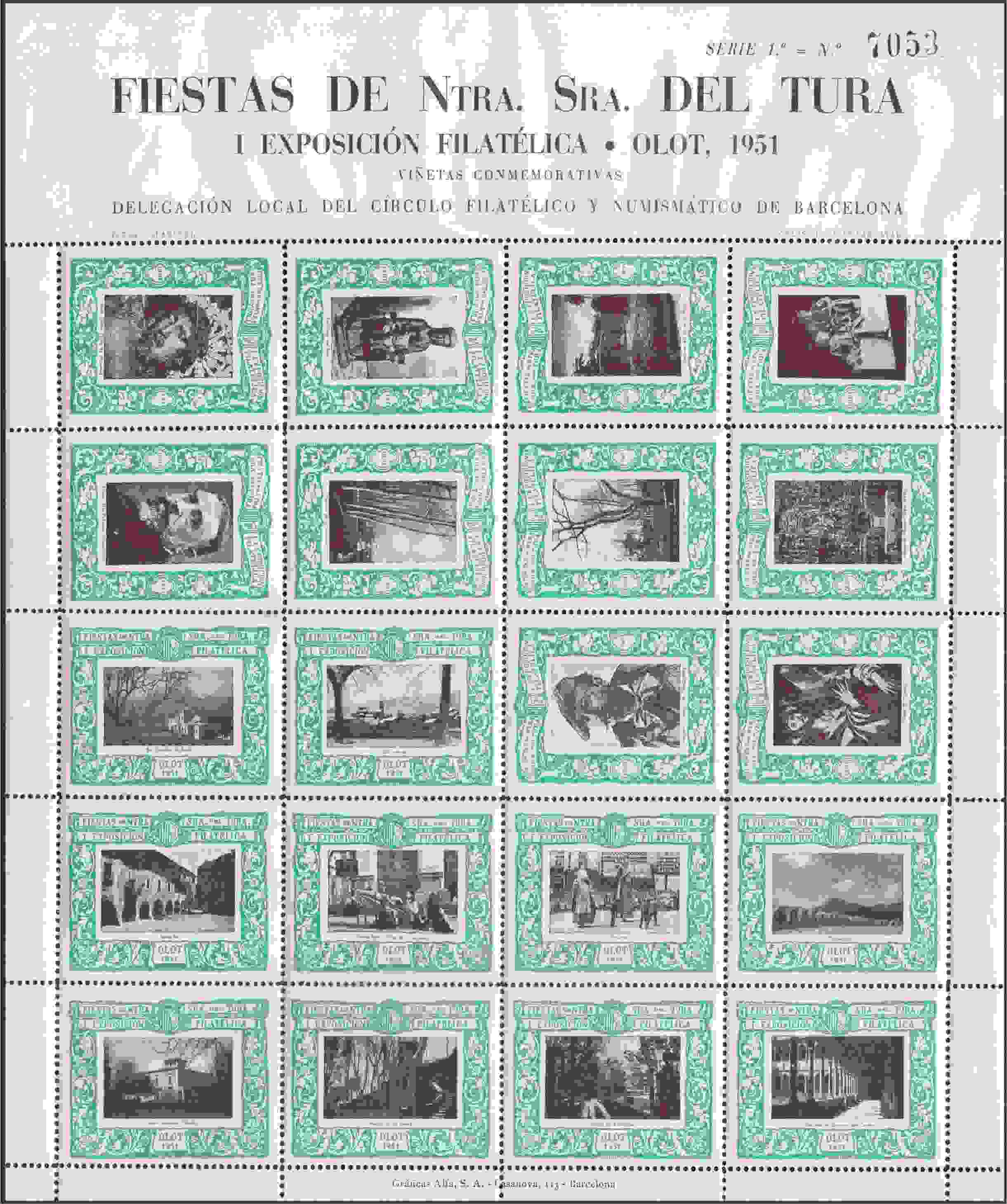 Subo ahora un pliego completo de 1951 para la 1ª Exposición Filatelica de Olot, que se habilitaría también para la segunda de 1952 y de la que subo también un par de viñetas,, me falta la cabecera.. Existen en ese color verde, en azul y también en marrón.