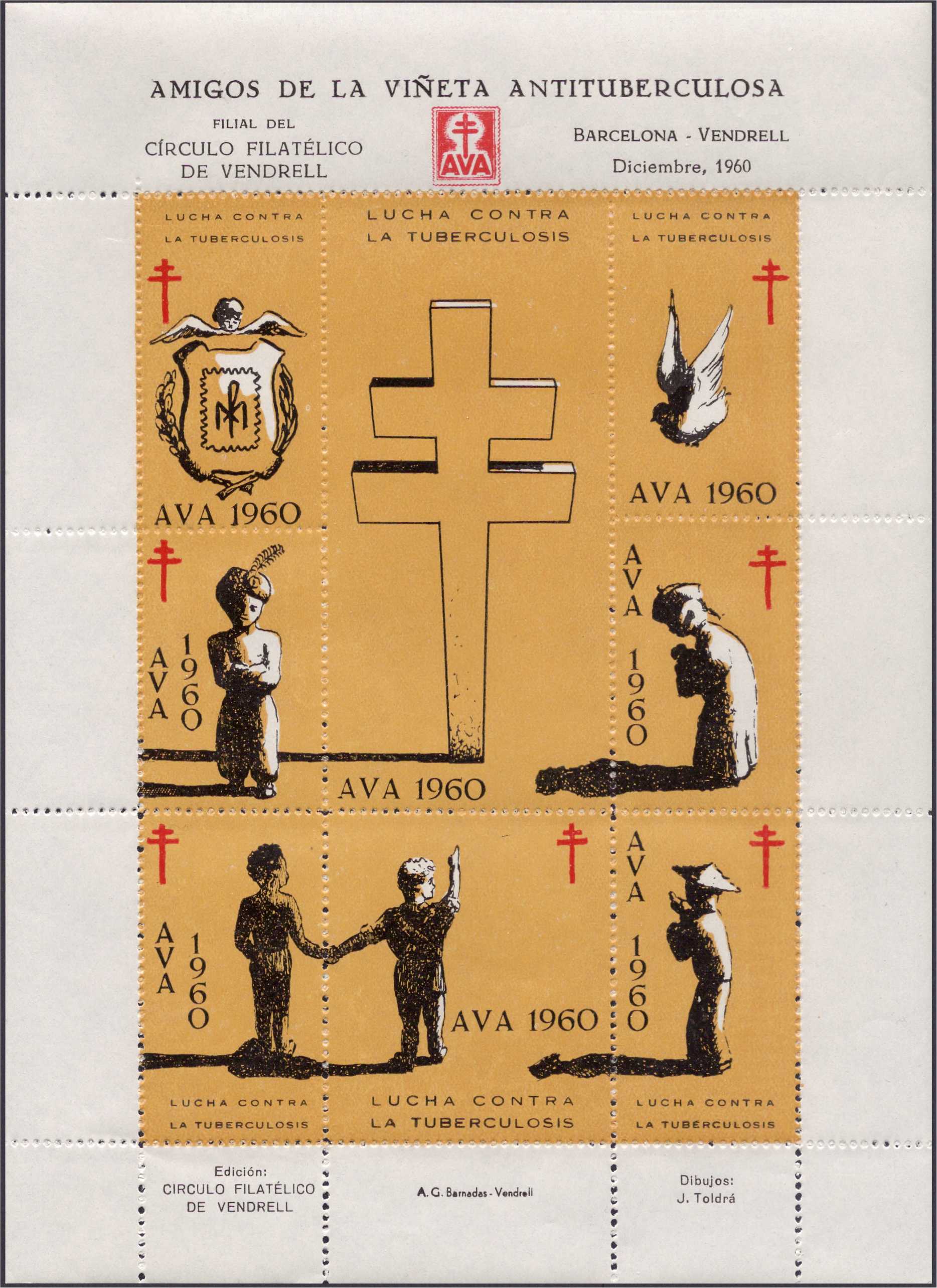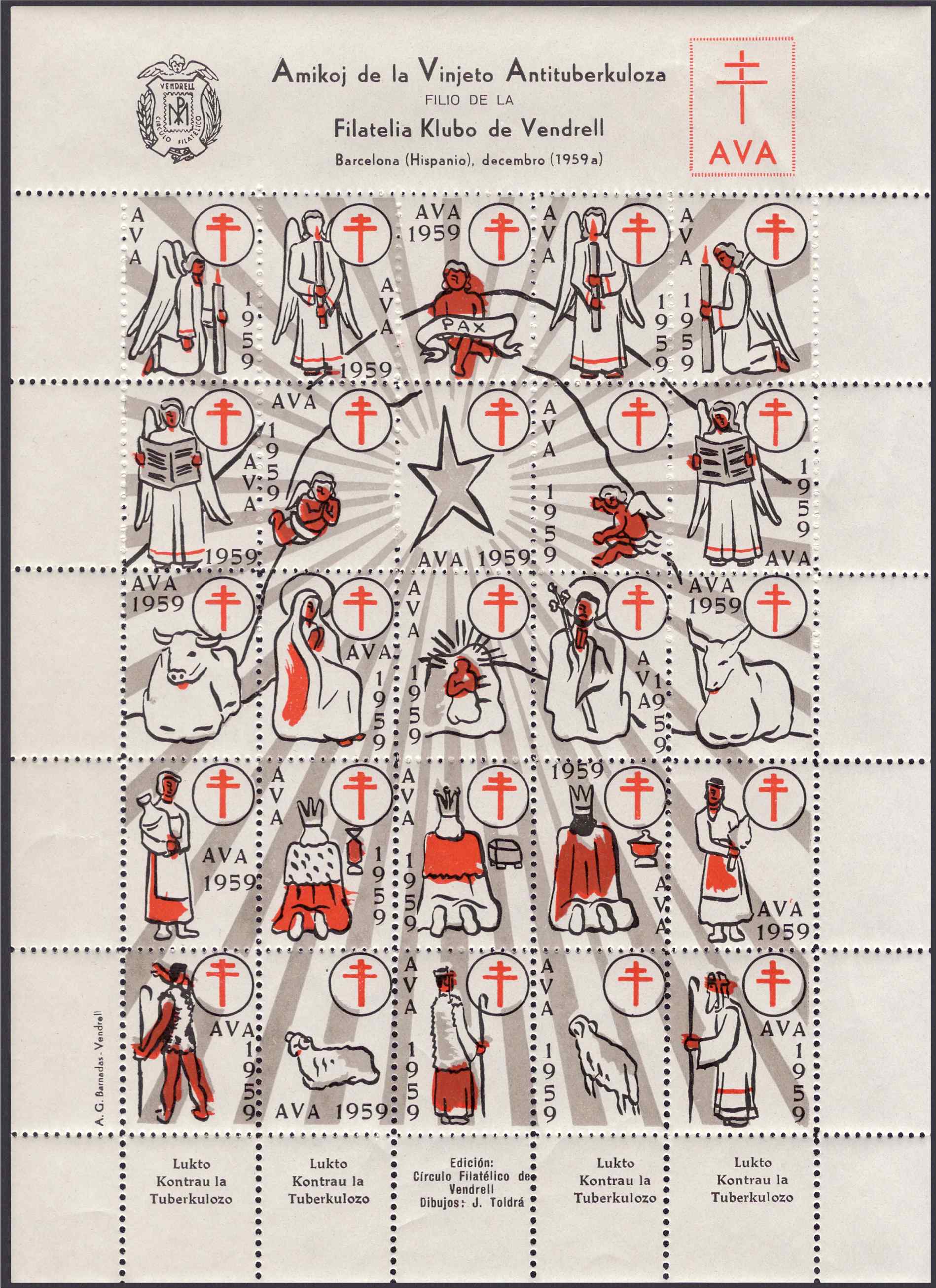 he preparado alguna del tema en el que estoy estos días, se trata de los amigos de la viñeta antituberculosa AVA de Vendrell, filial del Circulo Filatelico local, que fueron muy prolíficos en sus emisiones desde el año 1958 hasta el 1981, que sepa yo por el momento. Cada año se encuentra un diseño distinto en diversos colores y también en muchos de ellos en distintos tipo de papel coloreado, pudiendo estar a su vez en versiones castellana, catalán o esperanto y por supuesto también dentadas y sin dentar en algunas ocasiones.