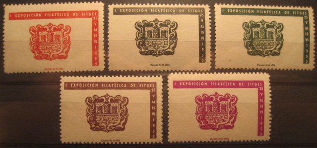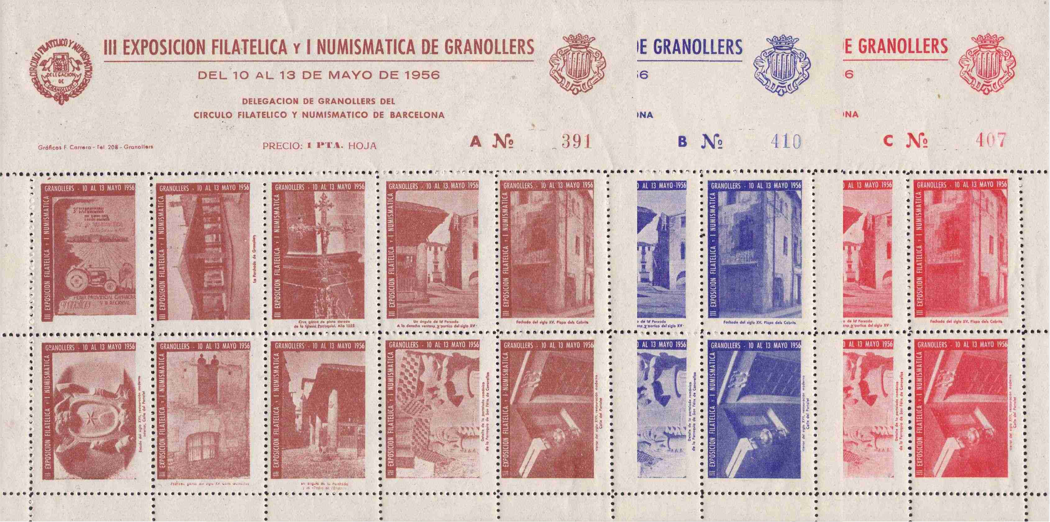Fomento del Turismo de Sitges editó en 1952 unos pliegos de 16 viñetas para la XIII Exposición Nacional de Claveles y I Exposición Filatélica, realizados en la imprenta F. Carreras de Granollers.