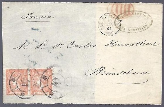 La primera (envuelta con texto) es con la rueda modificada de Bilbao y destino Viena en Austria y la otra (solo frontal) de San Sebastián con destino Remscheid en lo que era Prusia y hoy Alemania. Ambas van franqueadas con dos sellos de 12 cuartos para un total de 24 y que era la tarifa para un porteo simple correcto según los Convenios firmados con esos países.