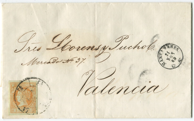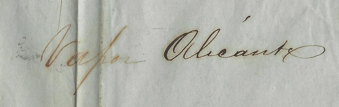 Curiosa la leyenda que lleva de "Vapor Alicante" y que fue escrita por el destinatario a la llegada y ocupa parte del frente y dorso de la carta (en un círculo verde puede verse la parte de la leyenda en el frente). Este barco (información facilitada por "Mochy" que también la vió) fue construído en 1858 para la compañía A. López y Cía y estaba originalmente destinado para cubir esa ruta, más tarde se vendíó y en 1882 se hundió en Puerto Rico (fuente de información http://nautarch.tamu.edu/shiplab/Newsletter0101a.pdf" onclick="window.open(this.href);return false; )