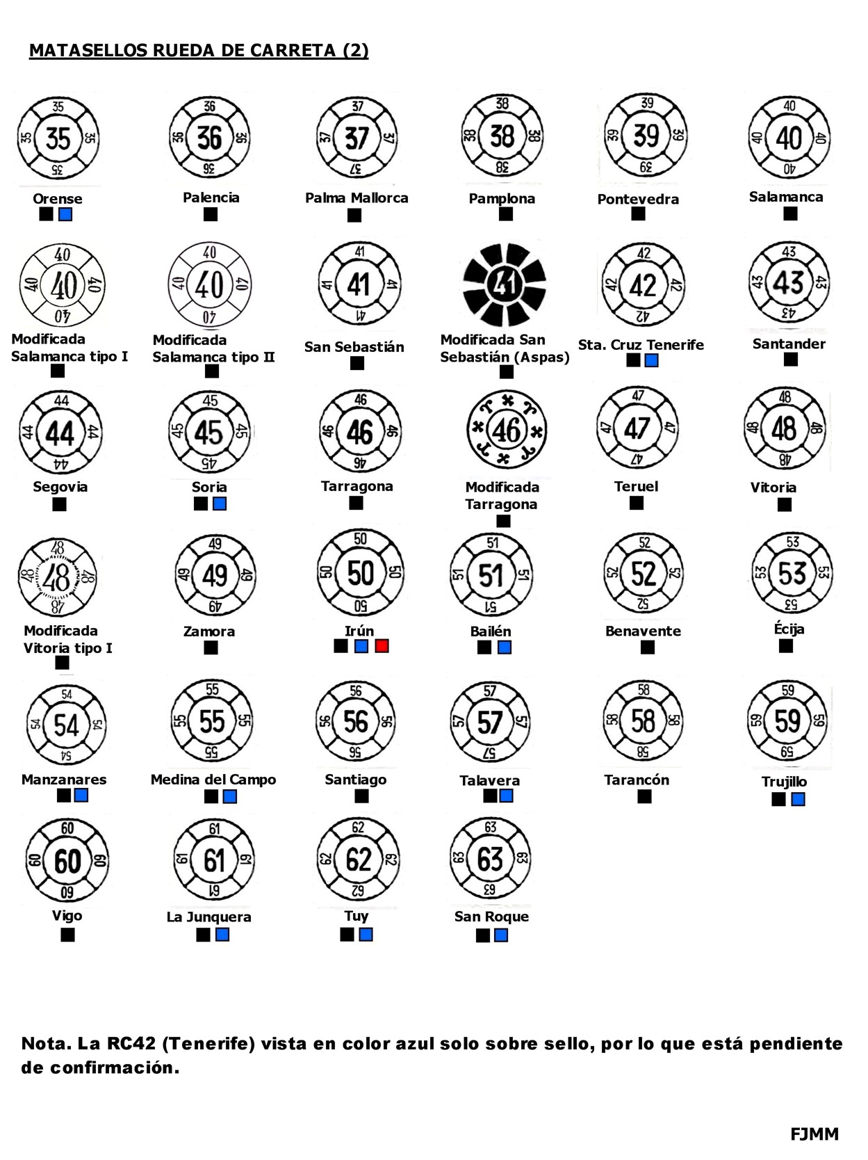 ) , vuelvo a hacerlo ya que las limpié y añadí los colores utilizados. Por cierto, he eliminado la rueda modificada tipo II de Vitoria, ya que en mi modesta opinión es una fantasía (la he visto siempre solo sobre sello y con varios numerales centrales diferentes, para mi demasiados matasellos para un espacio tan corto de tiempo de utilización).