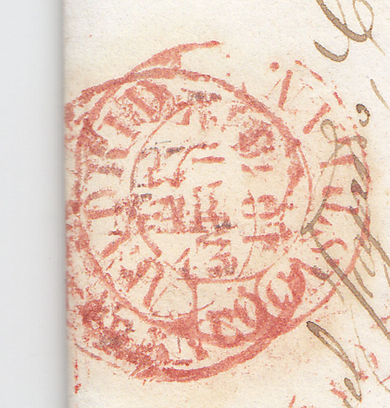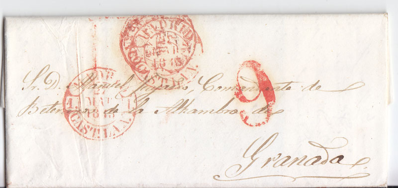 Esto se ve que fue un error del funcionario de turno -ya que fue rectificado por un Baeza, pero -aunque fuera por un despiste- la marca de Madrid Franco (PE 29) también se usó en color rojo en 1843 :wink:
