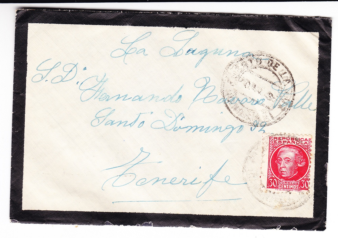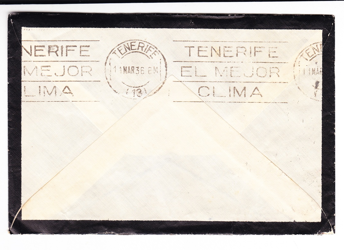Se trata del correspondiente a TENERIFE EL MEJOR CLIMA, y lo tengo con marca de llegada a D. Fernando Navarro Valle de La Laguna. en un sobre de pequeñas dimensiones (13,5x9) con ribetes de luto.