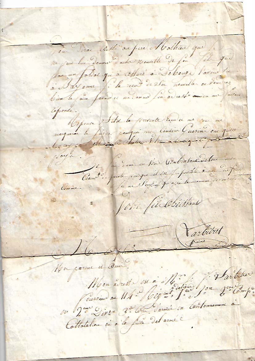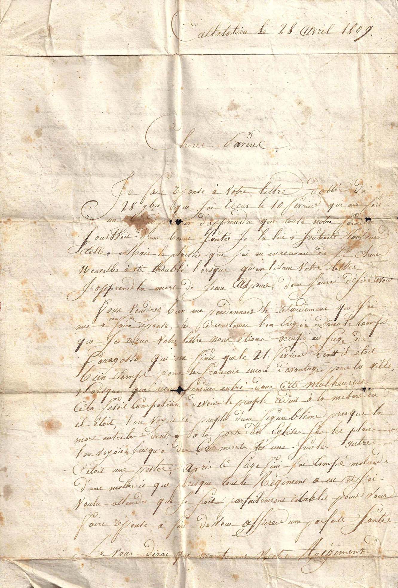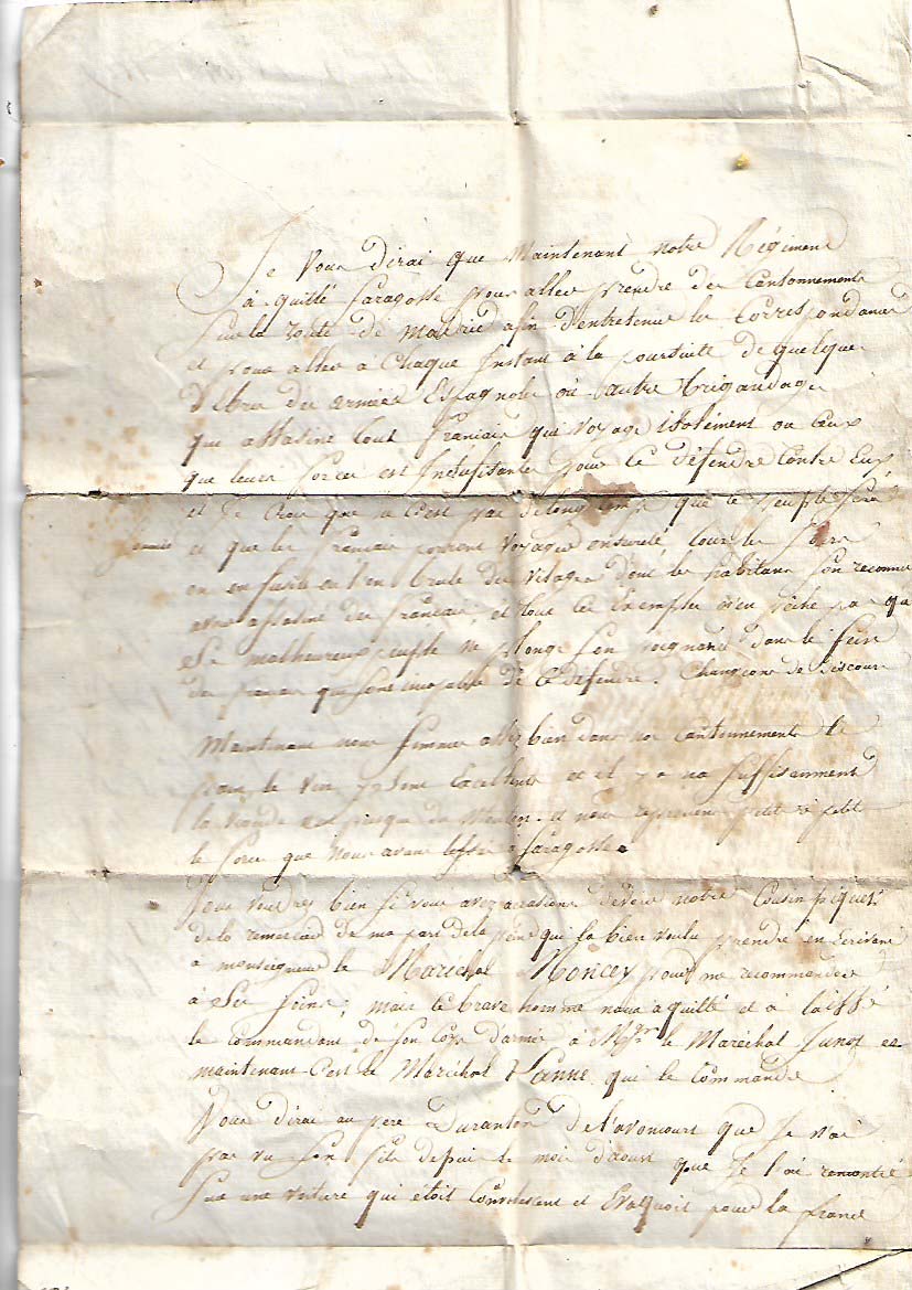 Se trata de una carta el mariscal Claude Victor Perrin, uno de los partícipes en la Batalla de Baza comandante los Dragones del 4º Cuerpo de Ejército que envía a su hermana Caroline Perrin (Condesa Vincent de Margnolas y dama de honor de la Emperatiz Josefina y después de la emperatriz Maria Luisa) y que está fechada en Baza el 29 de diciembre de 1811, con la intención de felicitarle el nuevo año, aunque su intención principal no parece que sea esa, ya que le comunica que “hace once meses que no cobra el salario” y que “le ha escrito dos veces sin haber recibido respuesta, lo que le extraña porque siempre escribía regularmente” (Esto repetido en otros correos indica que los guerrilleros hacían su función) y que se lo comunique a la familia.