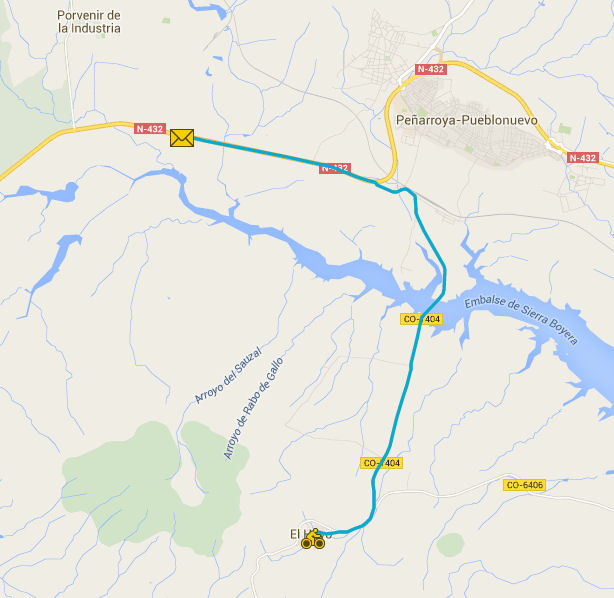 Después de mucho rebuscar y descartar otras opciones, me inclino, con alfareva, por el recorrido que se ve en la imagen. De El Hoyo, en el municipio de Belmez, a La Parrilla, un desaparecido poblado minero, en el municipio de Fuenteovejuna, con cargadero en la línea ferroviaria de Peñarroya a Fuente del Arco.