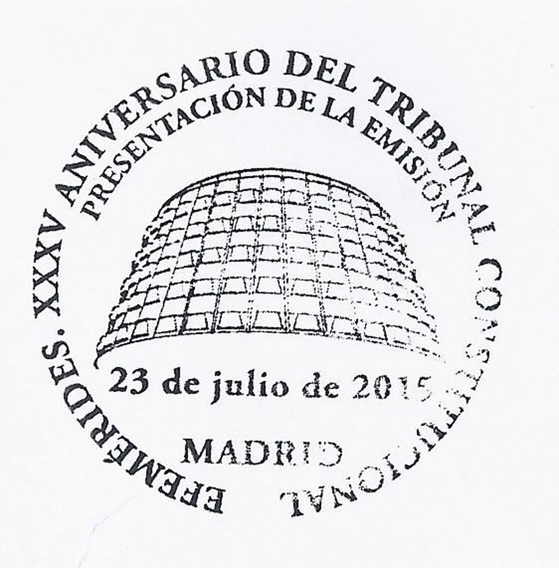 Reproduzco el matasellos usado en la presentación, realizada el día de hoy, 23 de julio, en Madrid, del la hoja bloque conmemorativa del "XXXV Aniversario del Tribunal Constitucional".