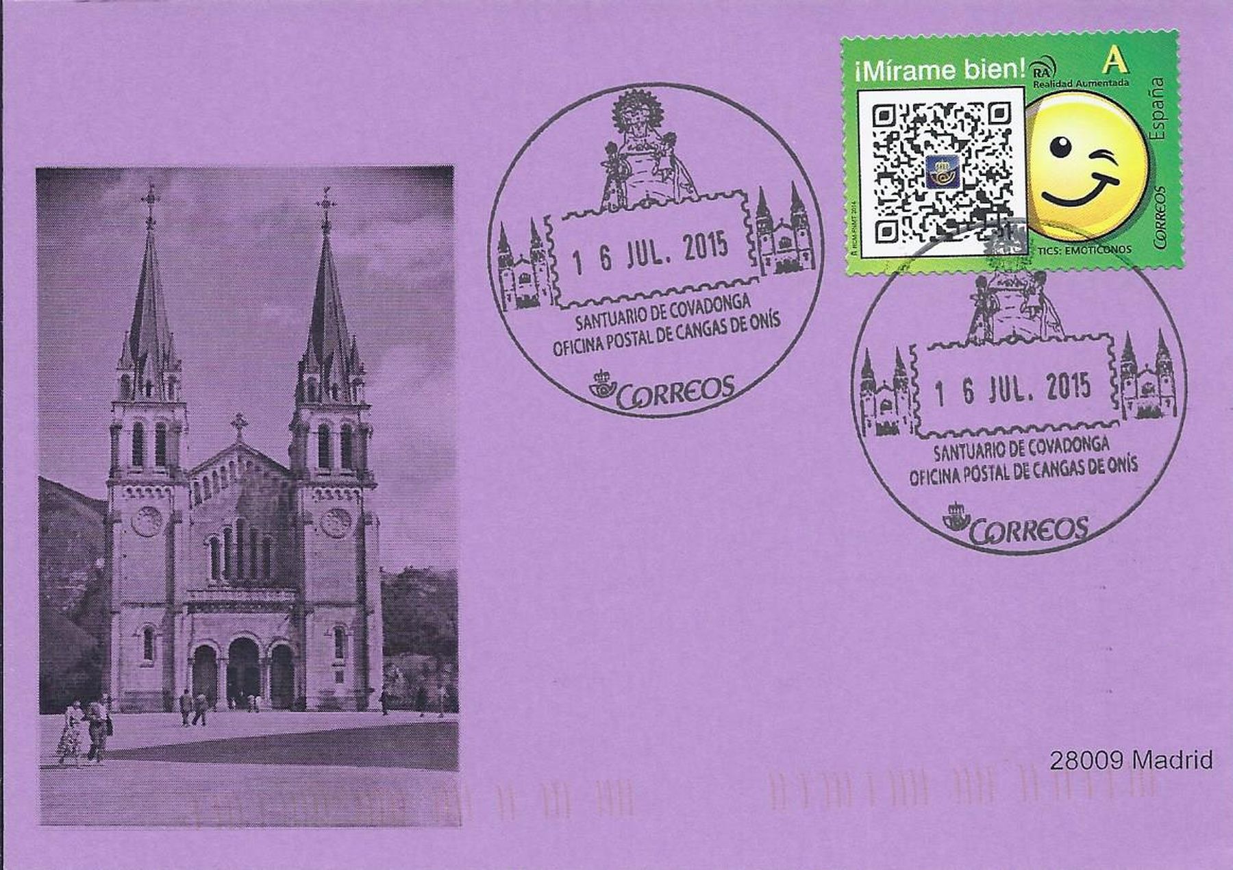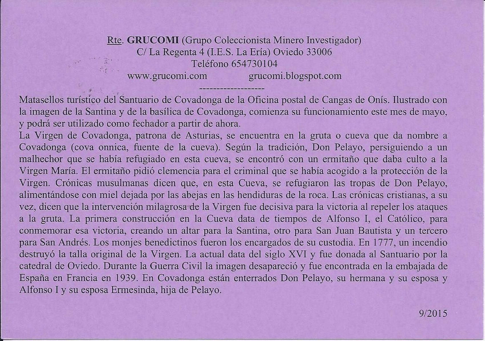La novena de ellas (9/2015) hace referencia al matasellos turístico que, dedicado al Santuario de Covadonga, se ha puesto en funcionamiento en la Oficina Postal de Cangas de Onís.