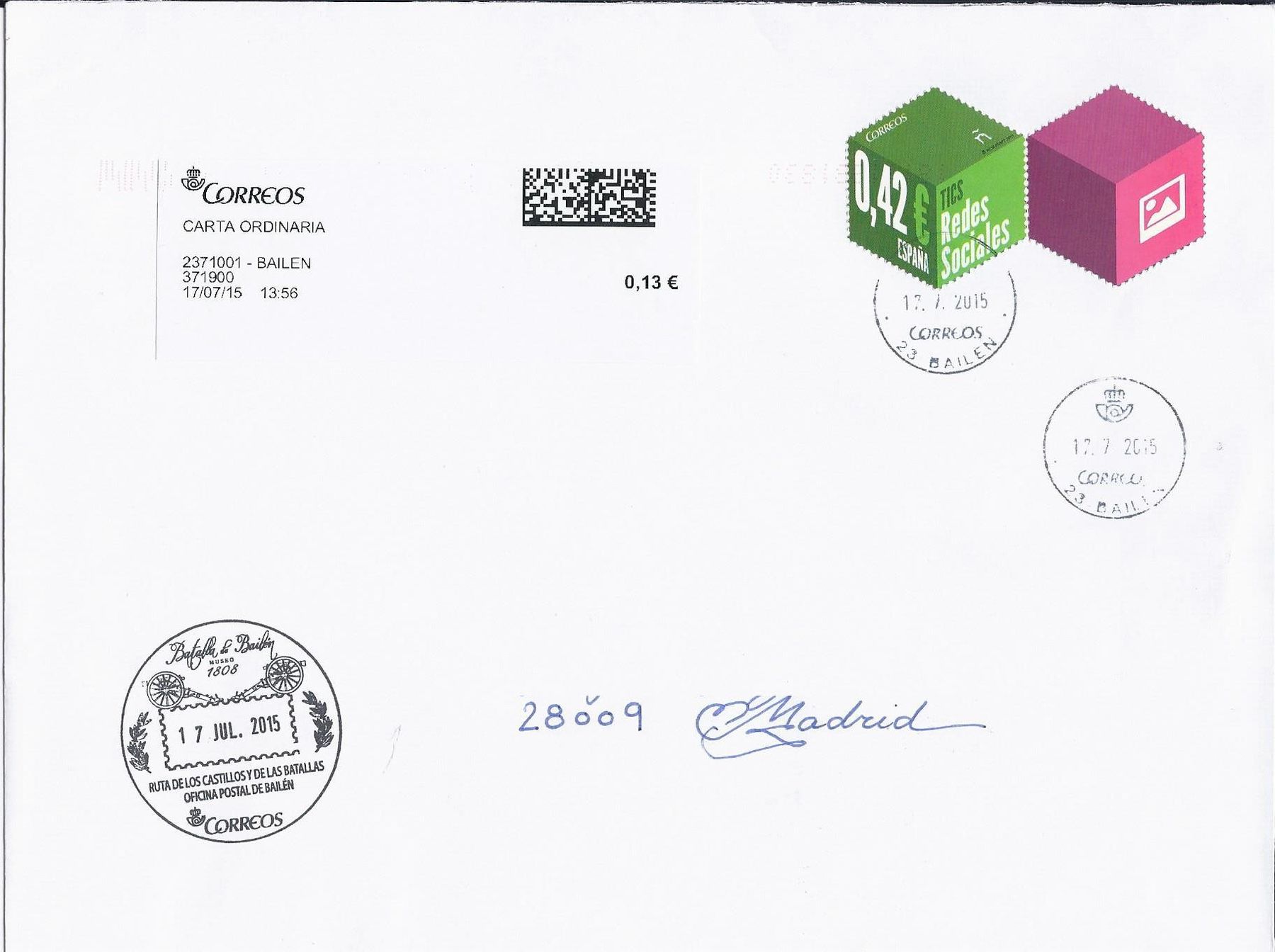 En esta ocasión se trata del matasellos del Museo de la Batalla de Bailén 1808, dentro de la Ruta de los Castillos y de las Batallas y que se puede obtener en la Oficina Postal de Bailén. Lleva la fecha del 17/07/2015.