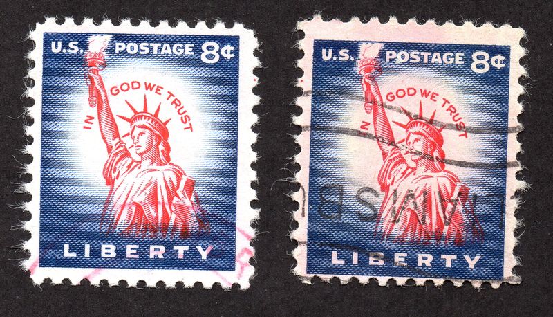 En los tres que as puesto tú en los dos primeros en el círculo de atrás tenemos un poco de rosado mejor dicho carmín. Y en el tercero es blanco , y la P dé Postage tapa la llama de lantorcha. Lo que no me cuadra es el mío de la izquierda que el círculo de atrás es blanco , pero la P no tapa la llama de la antorcha .