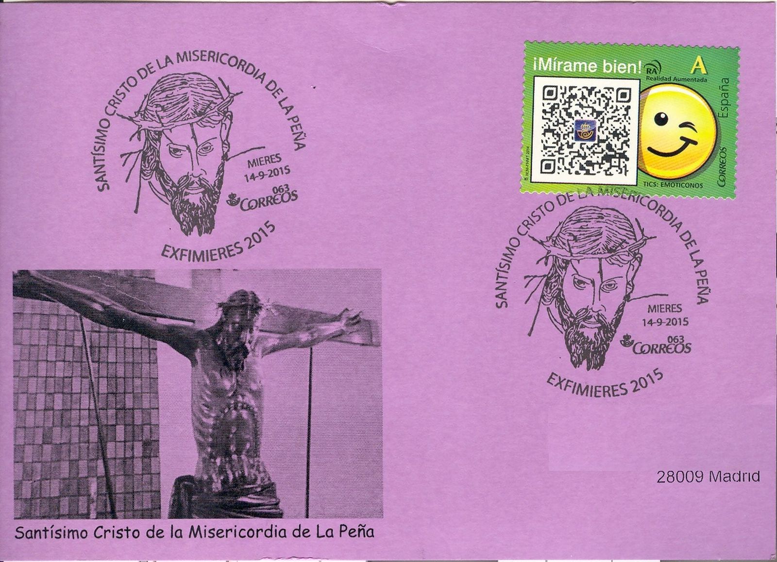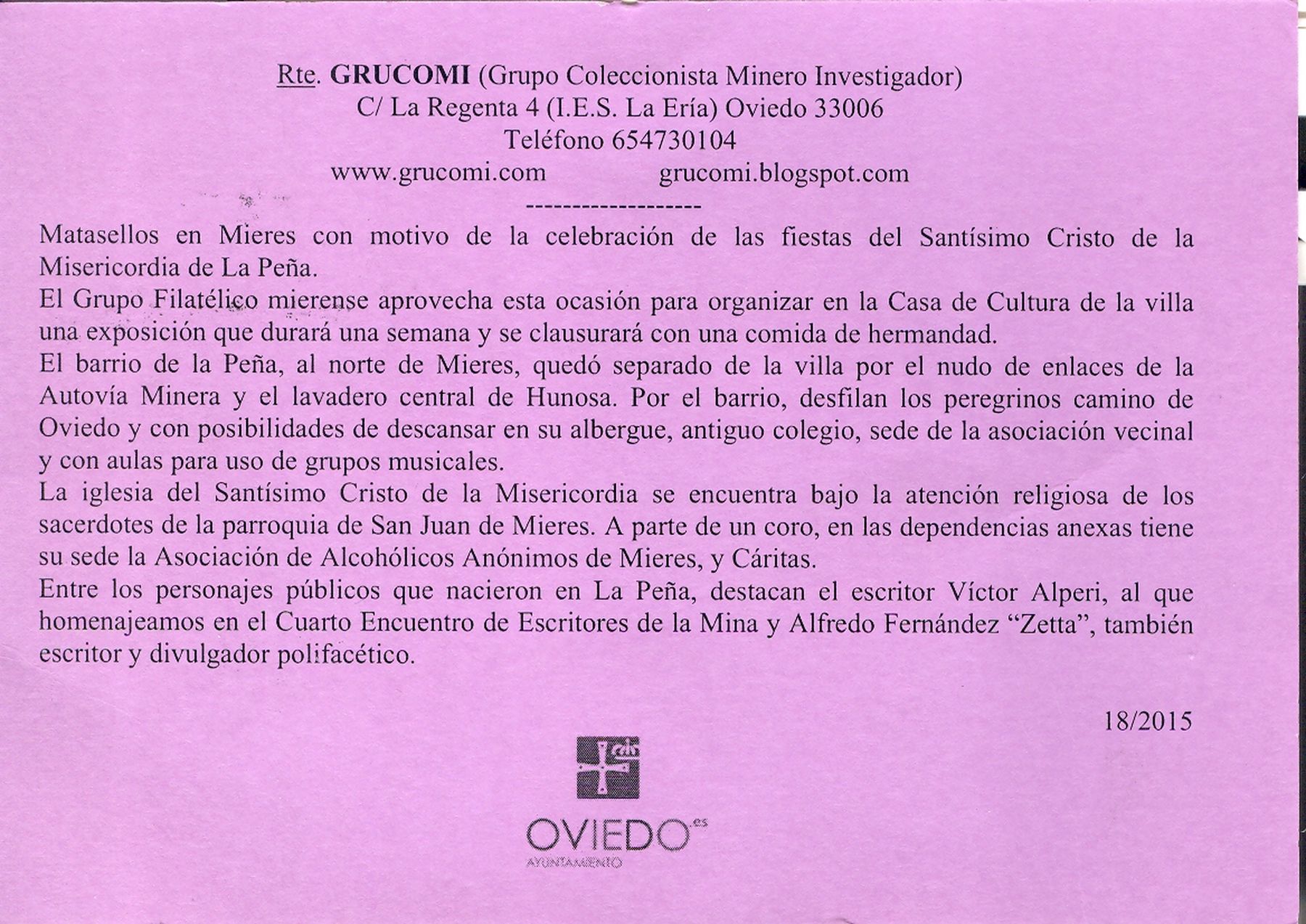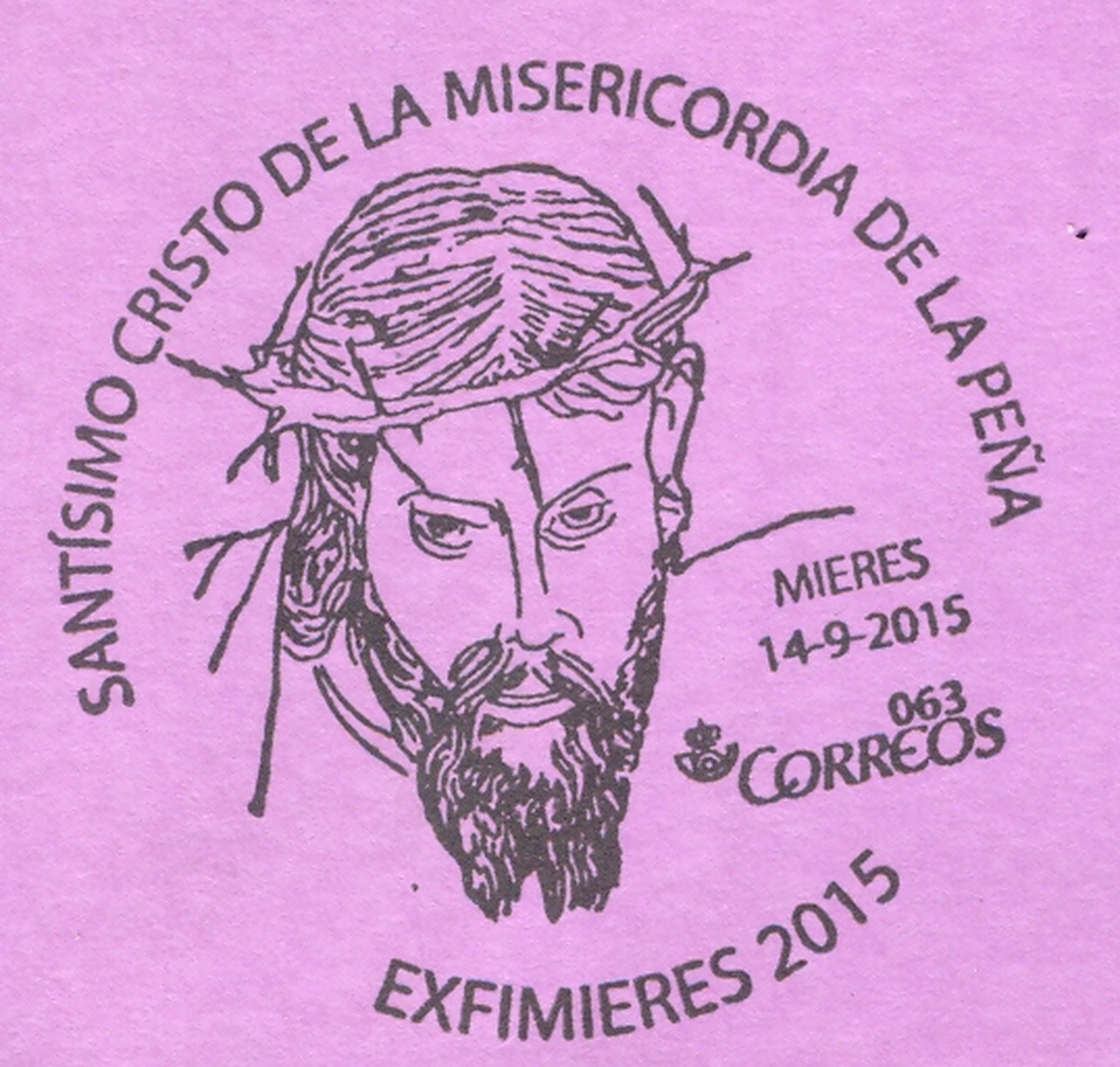 La decimoctava de ellas (18/2015) hace referencia al matasellos conmemorativo, usado en Mieres, de la EXFIMIERES 2015, dedicado al Santísimo Cristo de la Misericordia de la Peña.