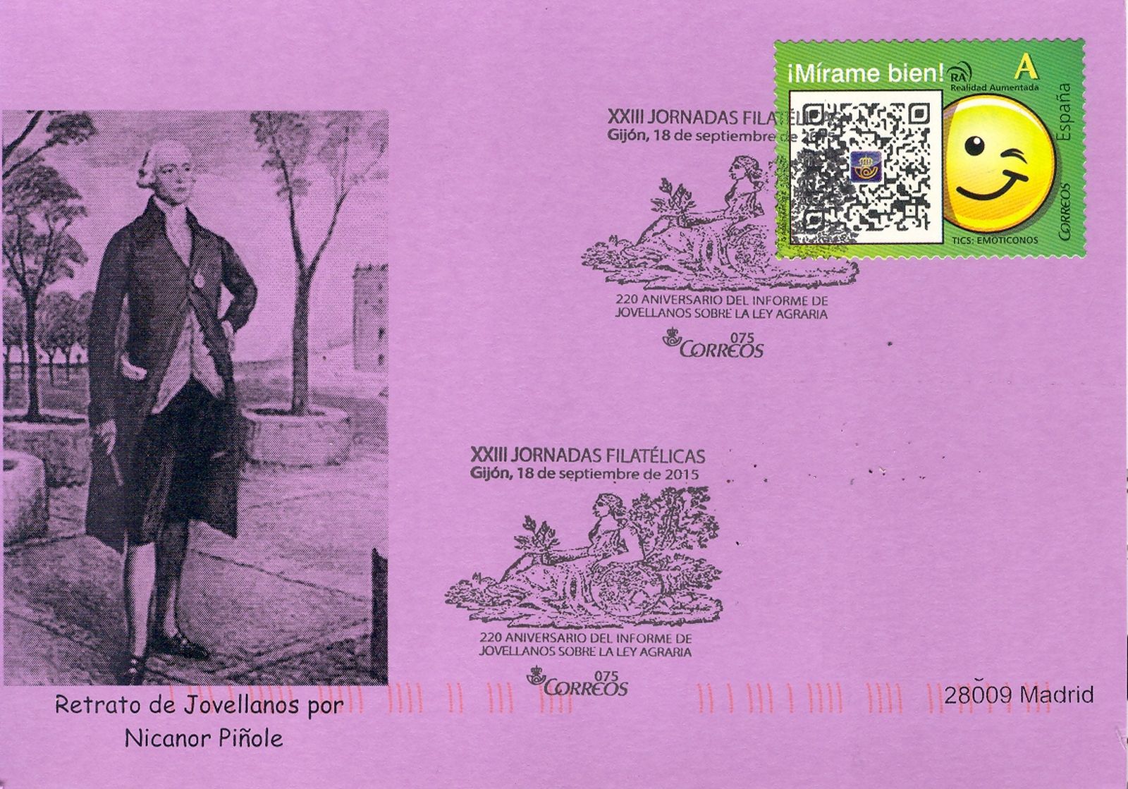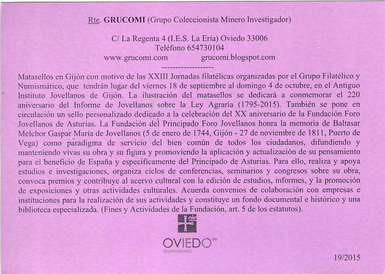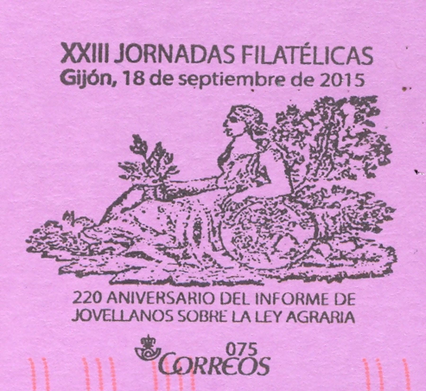 La decimonovena de ellas (19/2015) hace referencia al matasellos, usado en Gijón, conmemorativo de las XXIII JORNADAS FILATÉLICAS y está dedicado al 220 aniversario del informe de Jovellanos sobre la Ley Agraria.