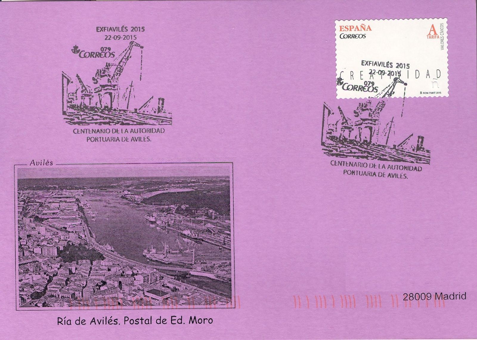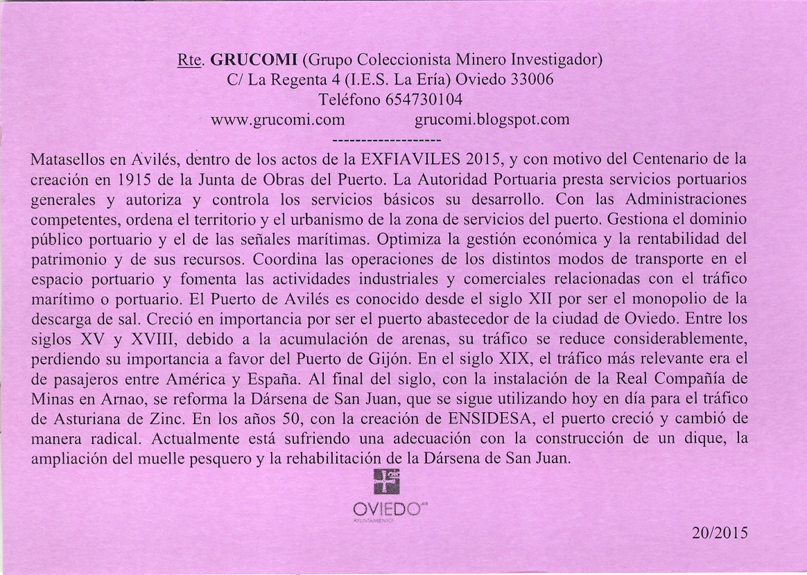 La vigésima de ellas (20/2015) hace referencia al matasellos, usado en Avilés, conmemorativo de la EXFIAVILÉS 2015 y está dedicado al Centenario de la Autoridad Portuaria de Avilés.