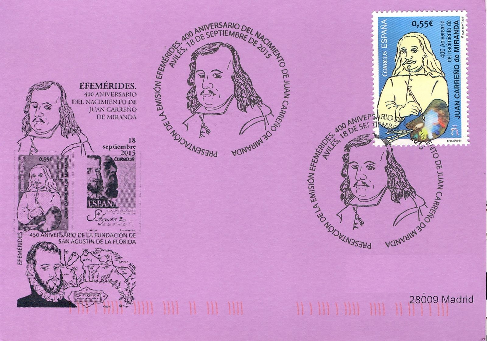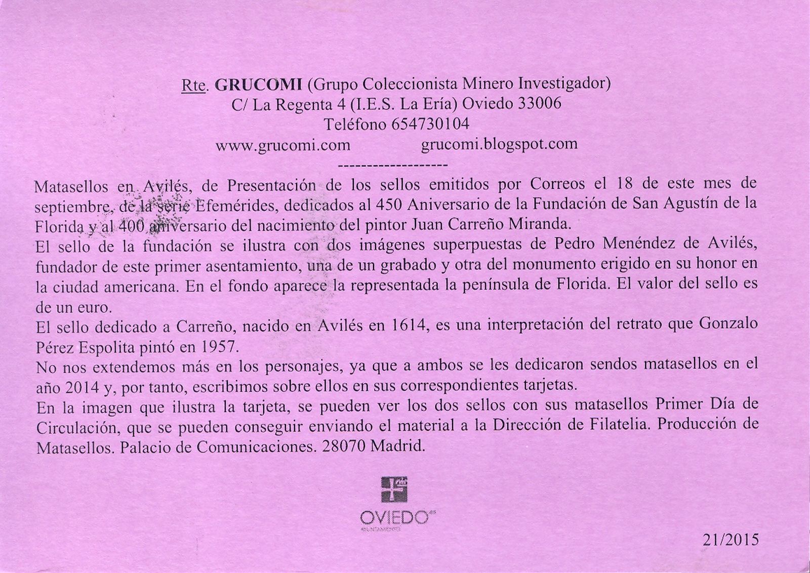 La vigésima primera de ellas del año 2015 (21/2015) hace referencia al matasellos, usado en Avilés, relativo a la presentación del sello dedicado al "400 Aniversario del Nacimiento de Juan Carreño de Miranda".
