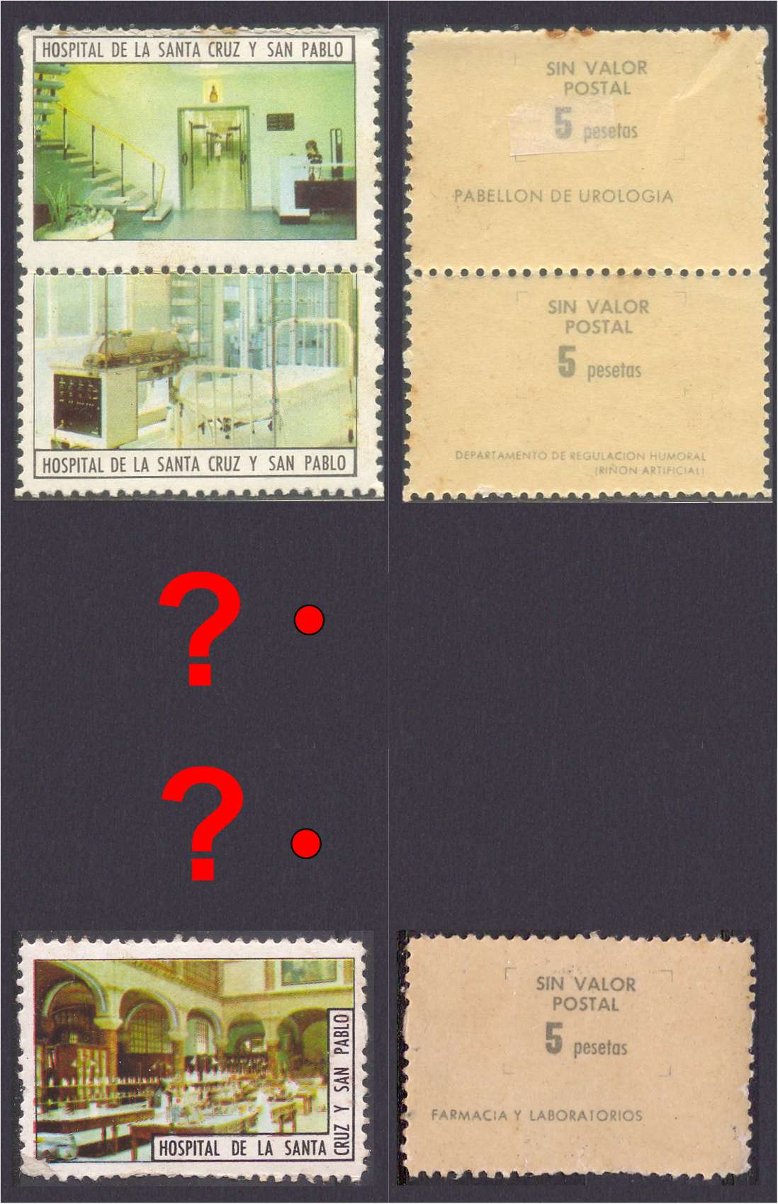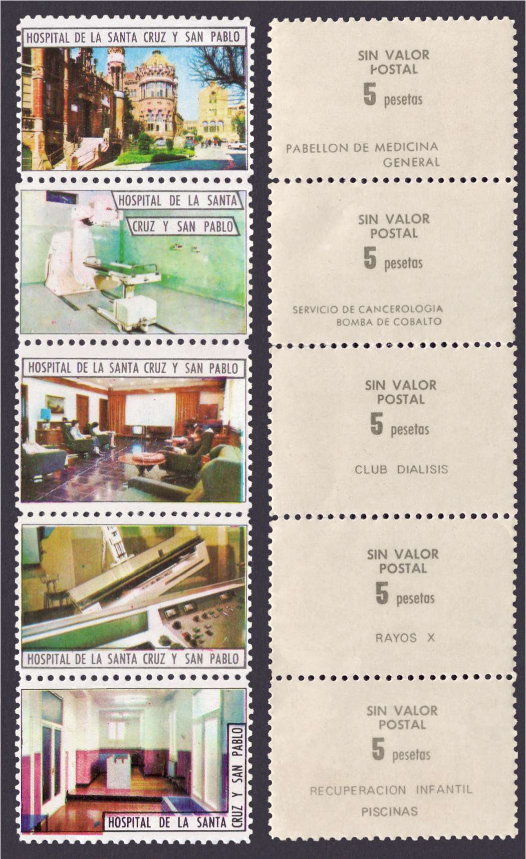 Efectivamente Felix, este último pertenece a una serie de cinco imágenes de pabellones e intalaciones del Hospital, existiendo diez series por pliego en columna y cada imagen lleva su descripción y el valor de 1 peseta en el reverso. El dentado es troquelado en líneas.