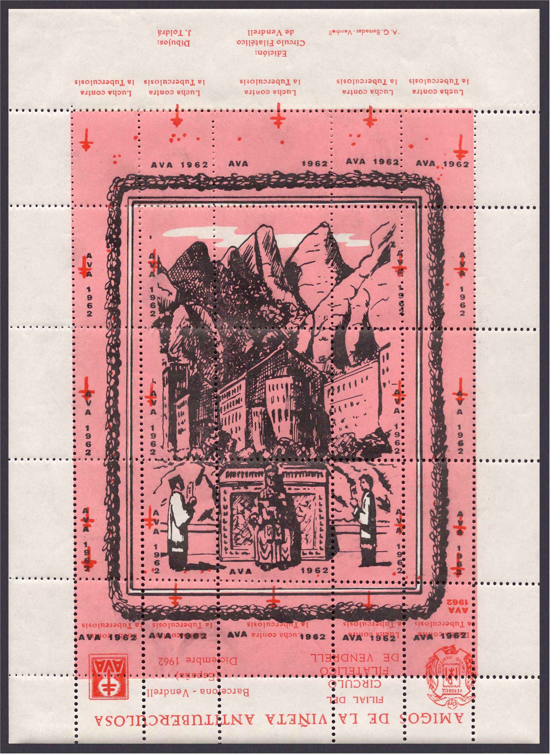 Siguiendo en Vendrell, subo ahora una hojita antituberculosa de 1962,, negro y rosa sobre fondo blanco, dentada, es variedad por las leyendas al reves.