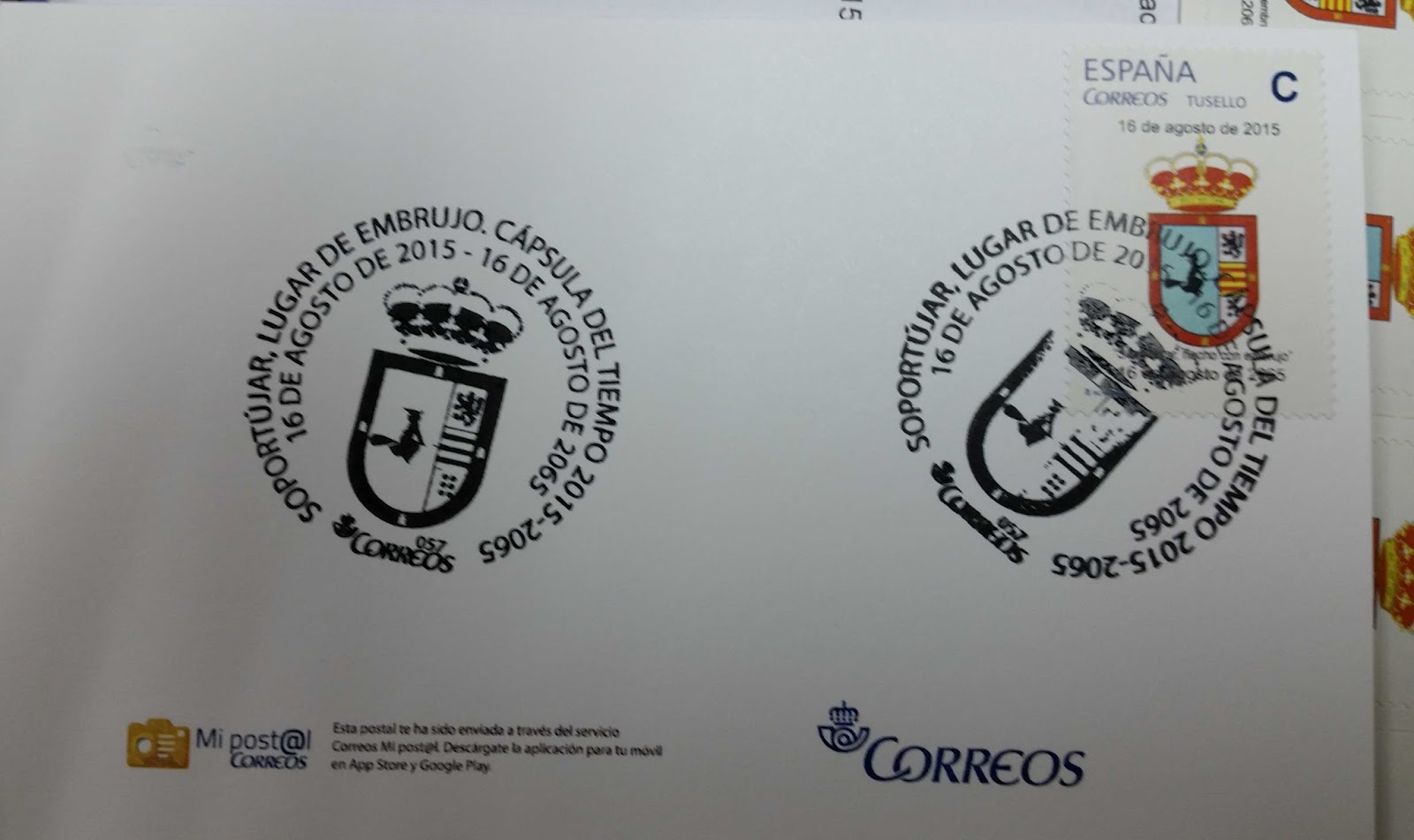 [hr]Madrid, 14 de agosto de 2015.- El pasado domingo, 16 de agosto, se selló en el alpujarreño pueblo de Soportújar una Cápsula del Tiempo que guardará durante medio siglo las leyendas e historias de sus vecinos. Esta original iniciativa, pensada para reforzar el atractivo turístico de la localidad, ha contado con la colaboración de CORREOS que ha emitido un matasellos especial 2015-2065, ha editado 1.000 tarjetas postales con la imagen de la emblemática “Fuente de las Brujas” de Soportújar, así como una tirada especial de “TUSELLO” con 50 sellos personalizados con el escudo de la población.