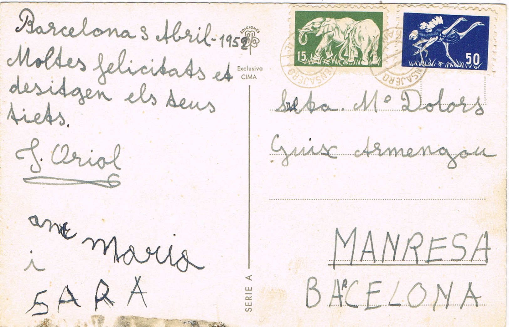 La Postal parece salida de Barcelona en 1952 y dirigida a Manresa.