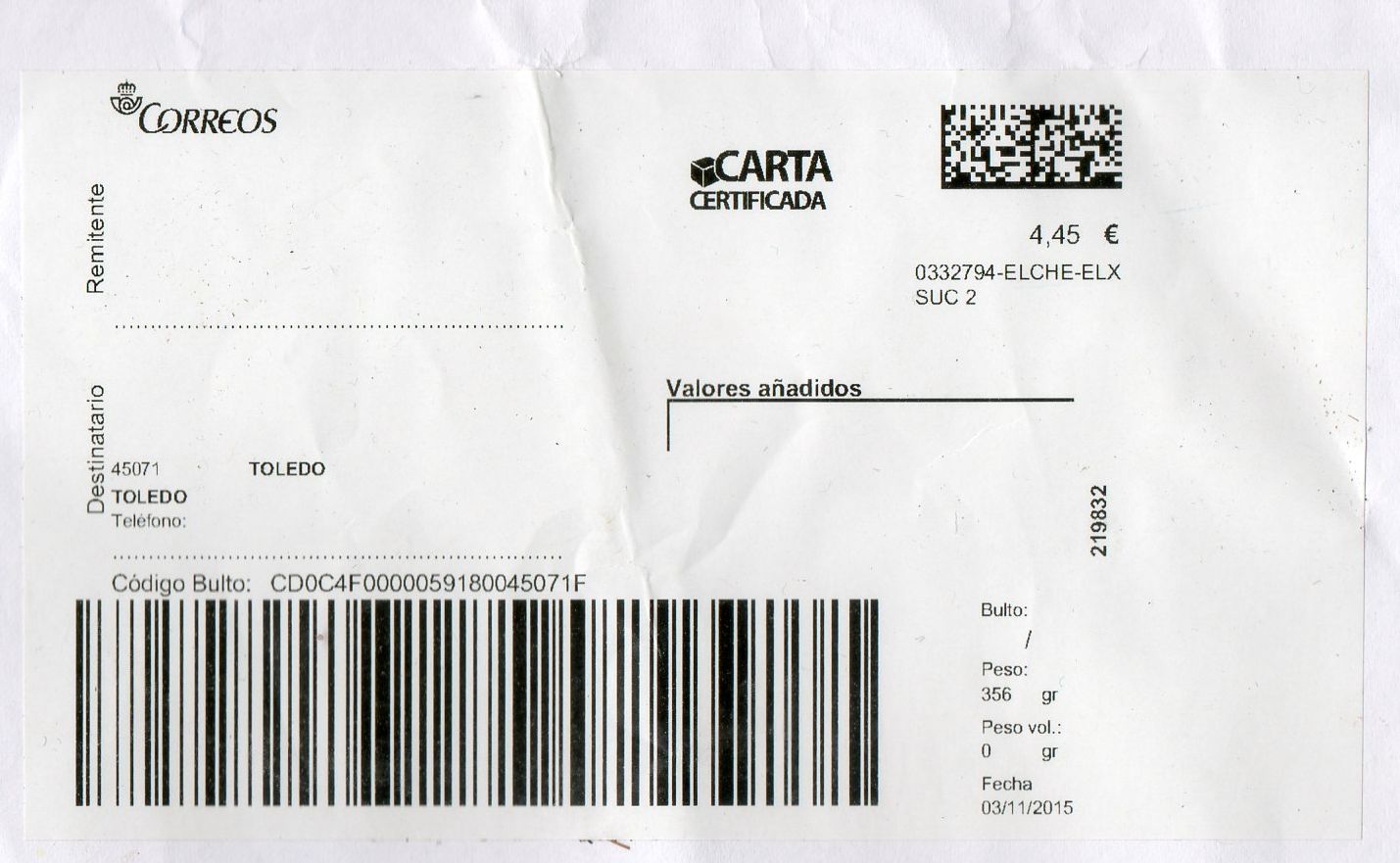0332794-ELCHE-ELX SUC 2 / CARTA CERTIFICADA / 03/11/15. Esta no ha pasado por el peluquero...