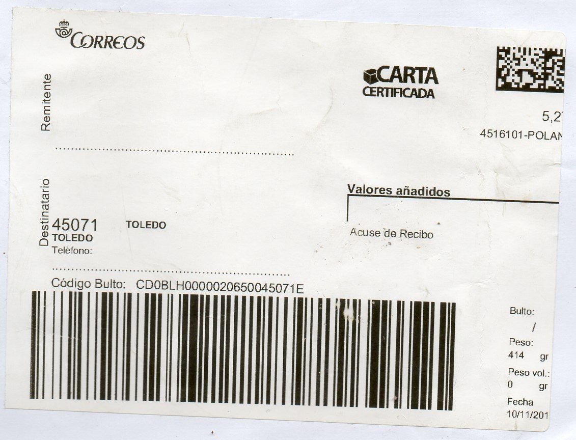 Muestro la etiqueta indicada, junto con el sobre donde se encuentra pegada ya que su valor de 0,00 indica que el franqueo ya había sido abonado con sellos (sobrando un céntimo, eso sí).