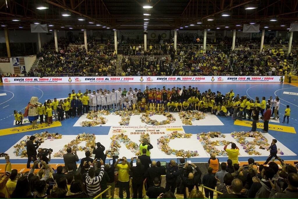 Empleados voluntarios de la oficina de Antequera y del Equipo de Solidaridad de Málaga de CORREOS, patrocinador principal de la Real Federación Española de Balonmano, se sumaron junto a familiares y amigos a esta iniciativa con una lluvia solidaria de peluches que los asistentes lanzaron al parqué al escuchar el aviso de megafonía. Después de formar las letras STOP CANCER con los peluches, los voluntarios los recogieron para repartirlos entre los asistentes a cambio de una pequeña aportación de 6€ destinada a la Fundación Cris. Igualmente, entregaron peluches a todos aquellos que traían un mensaje de confirmación de envío de SMS a los números habilitados por la Fundación Cris para la causa, con el único fin de ayudar a recaudar fondos para la investigación del cáncer.