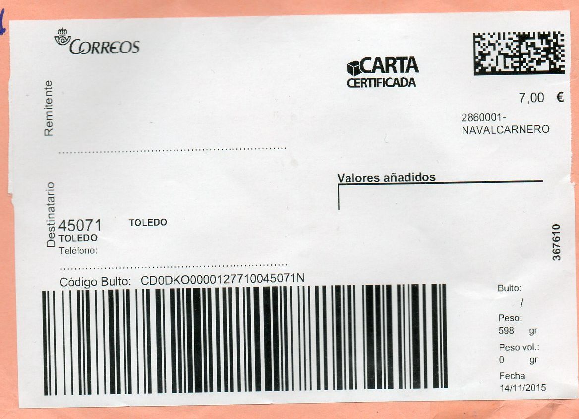 UNA TG. 2860001-NAVALCARNERO / CARTA CERTIFICADA 14/11/15