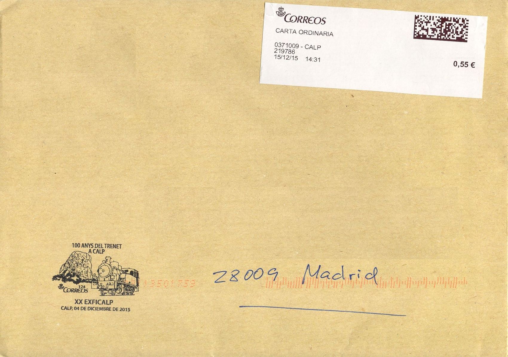 También muestro el sobre recibido para que se vea la amabilidad del personal de Correos de Calp que pusieron el matasellos en el sobre para luego adherir una etiqueta digital Zebra y dejarlo circular, sin que pasase por l alínea de matasellado del CTA aunque sí que lo indexaron.