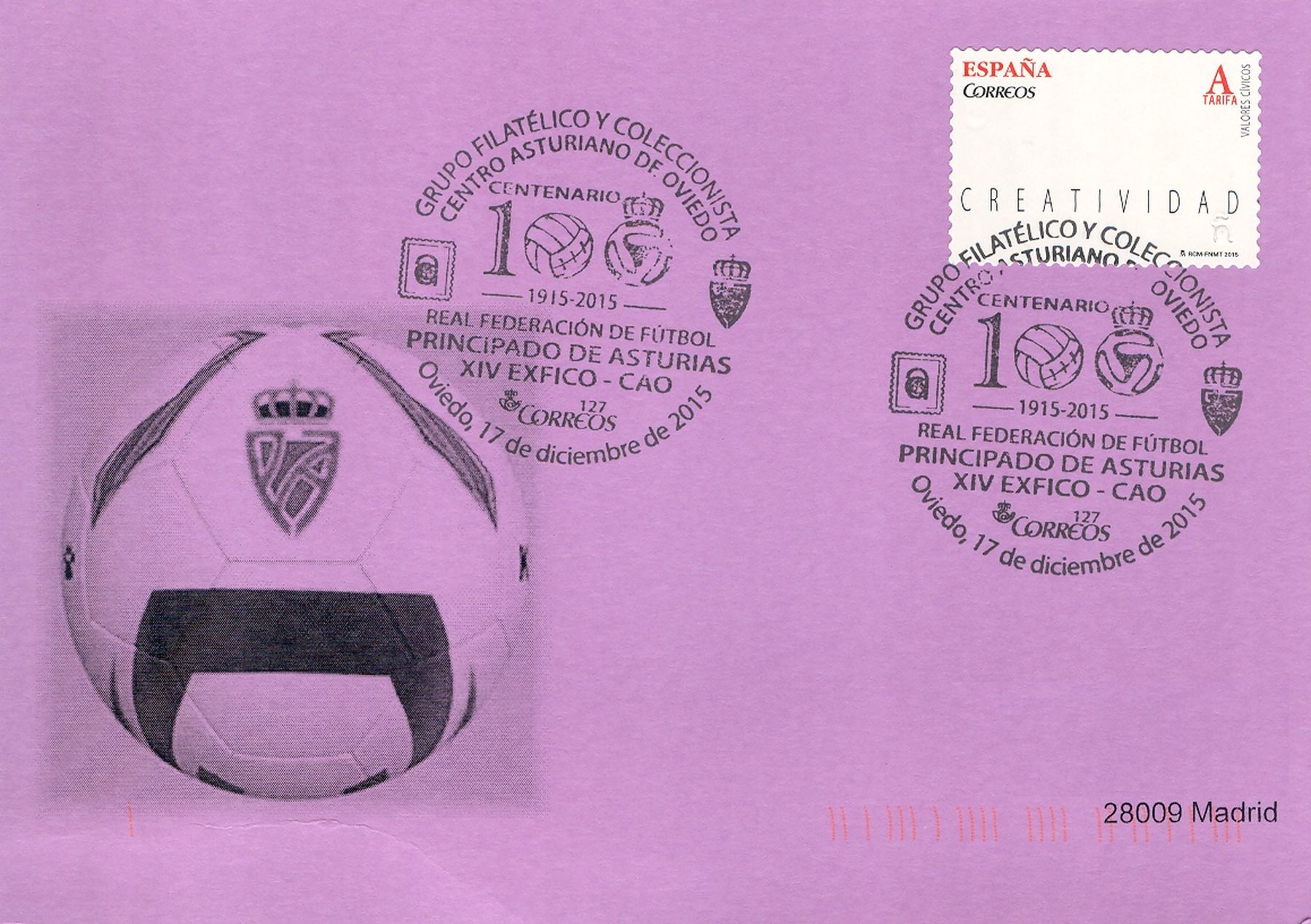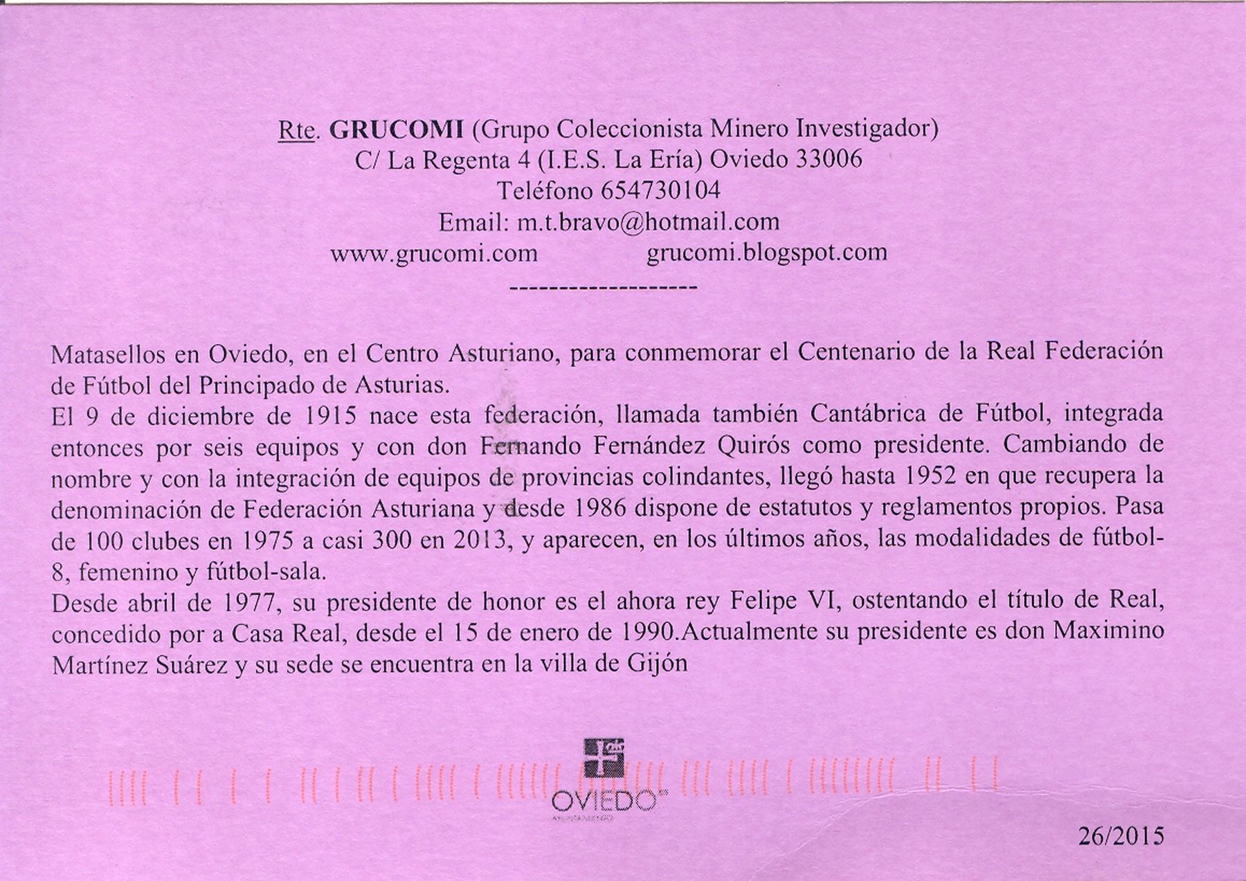 La vigésima sexta de ellas del año 2015 (25/2016) hace referencia al matasellos, usado en Oviedo, conmemorativo de la "XIV EXFICO - CAO. Centenario de la Real Federación de Fútbol del Principado de Asturias".