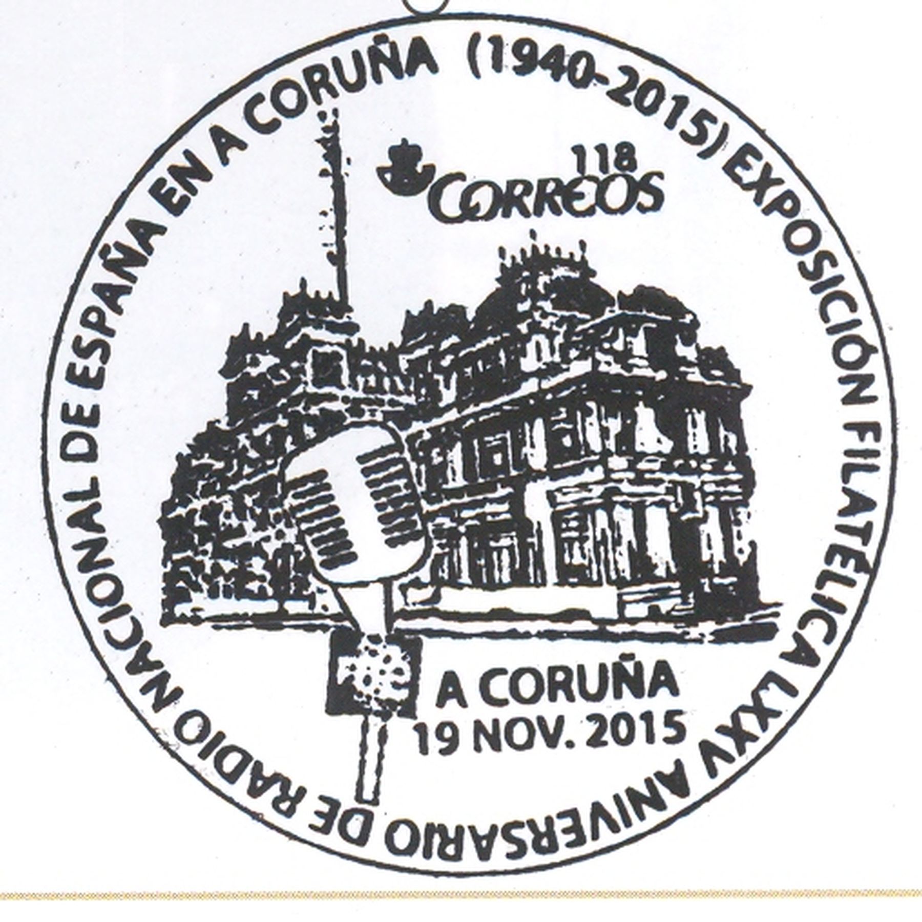 Y, aunque ya tenemos una imagen del mismo en la relación de matasellos del mes de noviembre que puse en la página anterior de este hilo, para que quede constancia del resultado de la estampación, aunque sea en un soporte no ortodoxo (en una página del catálogo de la exposición si sellos), reproduzco el matasellos empelado en "A Coruña" el pasado 19 de noviembre del año 2015, con ocasión de la Exposición Filatélica conmemorativa del LXXV Aniversario de Radio Nacional de España en A Coruña (1940-2015), que se celebró en la "Sala de Exposicións do Pazo Municipal" de La Coruña, del 19 al 29 de noviembre del año 2015.