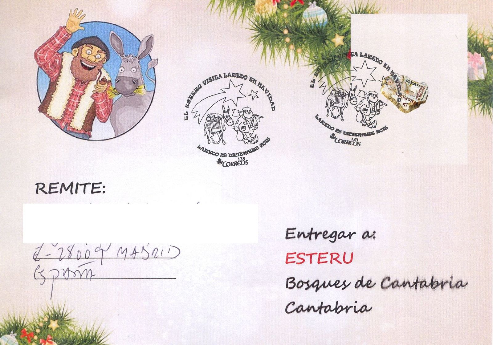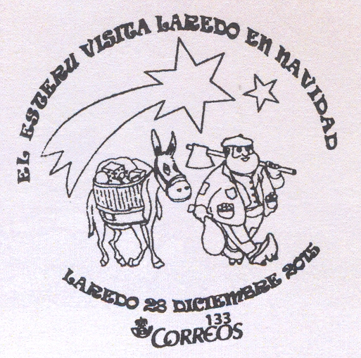 Y para seguir informando, en ausencia de la información que debía proporcionar la Subdirección de Filatelia de Correos, sobre los matasellos conmemorativos que están apareciendo en el mes de diciembre del año actual, reproduzco en este mensaje el matasellos conmemorativo utilizado en Laredo, Cantabria, el pasado 28 de diciembre del año 2015, recordando que "El Esteru visita Laredo en Navidad".