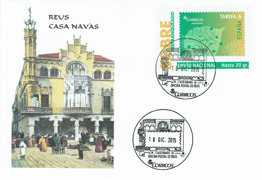 Adjunto matasello del día de la presentación del matasello de la Casa Navàs de Reus