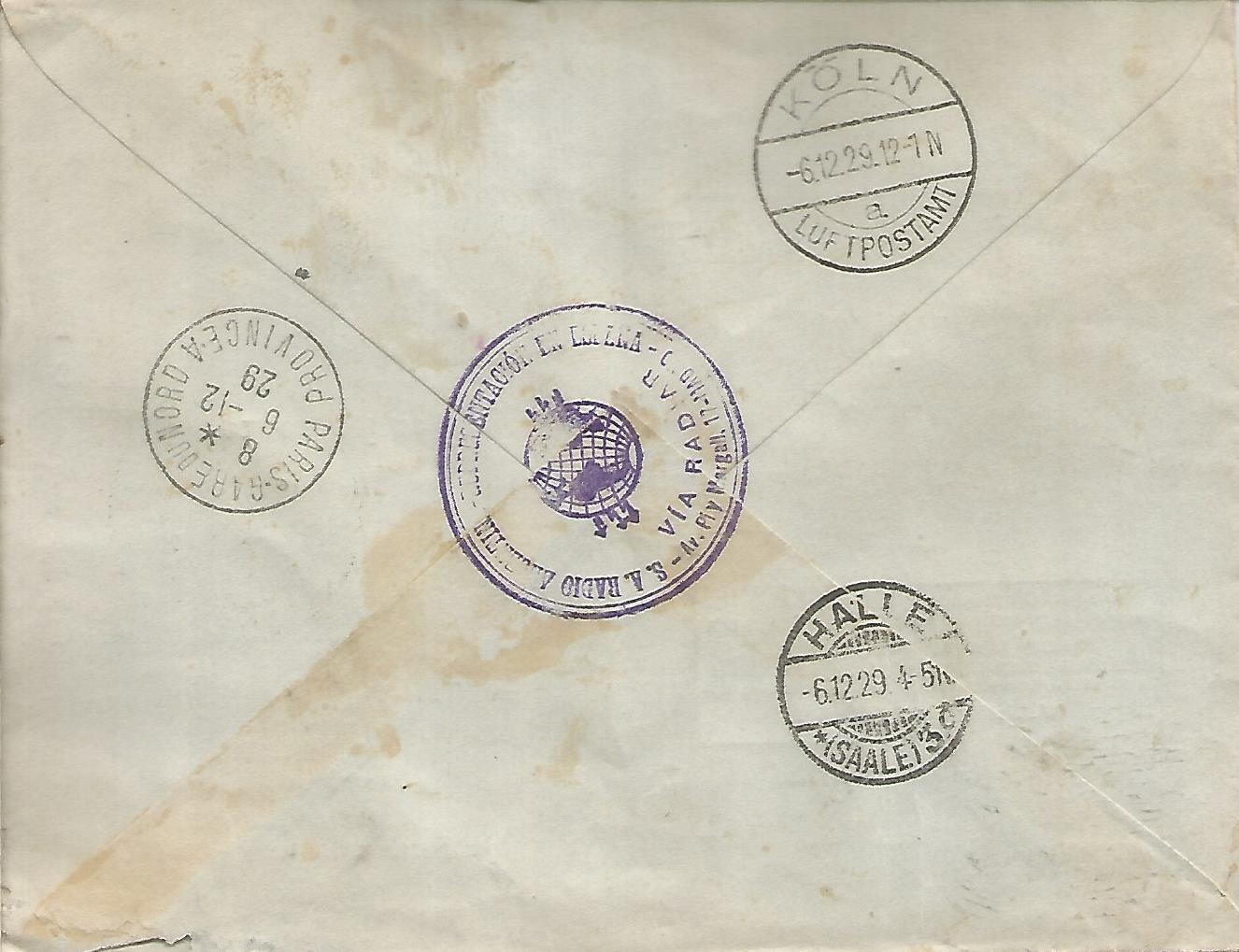Salida de Madrid 4-12-1929, llegada a París 6-12, llegada a aeropuerto de Colonia el 6-12 y llegada a destino en Halle el 6-12, donde la aplican una marca en color rojo de llegada de correo aéreo.
