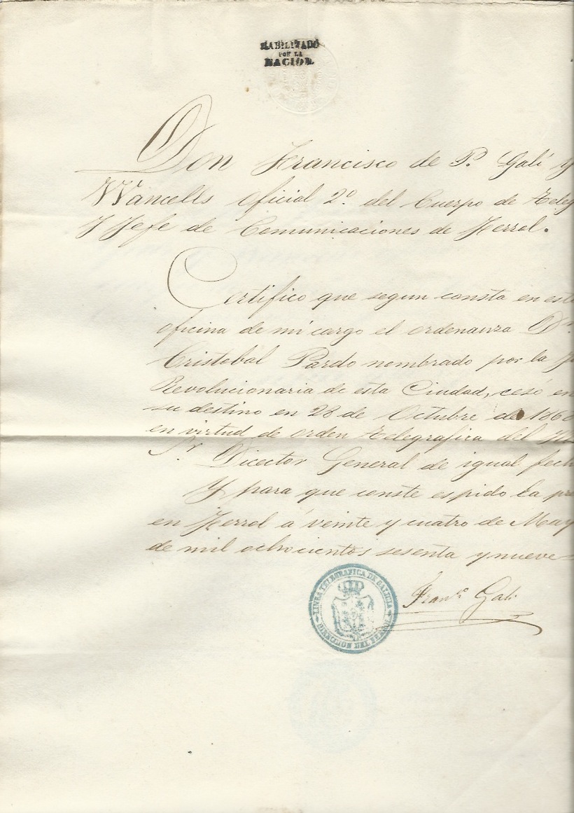 Ferrol,24/May/1869: "Don Francisco de P(aula) Gali y Wancells oficial 2º del Cuerpo de Telegrafos y Jefe de Comunicaciones de Ferrol.: Certifico que segun consta en esta oficina de mi cargo el ordenanza Dn.Cristobal Pardo nombrado por la Junta Revolucionaria de esta Ciudad,ceso en su destino en 28 de Octubre de 1868 en virtud de orden telegrafica del Ilmo Sr Director General de igual fecha.Y para que conste expido la presente en Ferrol a veinte y cuatro de Mayo de mil ochocientos sesenta y nueve".
