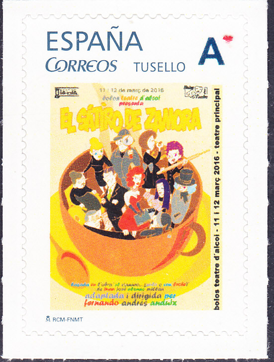 Nuevo Tu Sello realizado por encargo de la Compañia de Teatro Bolos Teatre de Alcoy, con la reproducción del cartel de la obra El Sátiro de Zamora, que estrenarán del 11 al 12 de Marzo en el Teatre Principal de esta localidad. Tirada 100 sellos. Nº asignado por Correos: 1610.143413.001/4.
